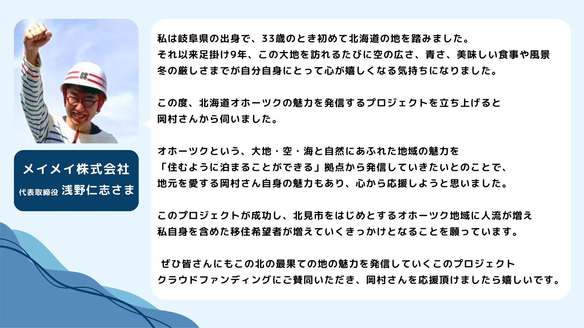 私は、一人でも多くの方にオホーツクで「楽しい」「美味しい」「美しい」を体験してもらい、その魅力を知っていただきたいと考えています。