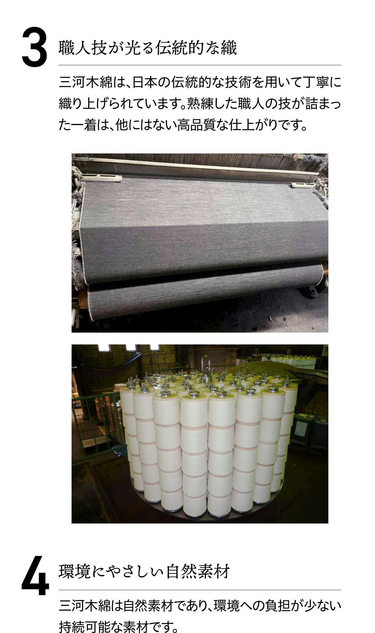 戦国時代から人々の暮らしに根付いてきた三河木綿は、日本の伝統的な織物として知られています。昔ながらの製法を守りながら、現代のライフスタイルに合うよう、デザインや使い心地を追求。古き良き日本の風情と、新しい感覚が融合した、魅力あふれる織物です。
