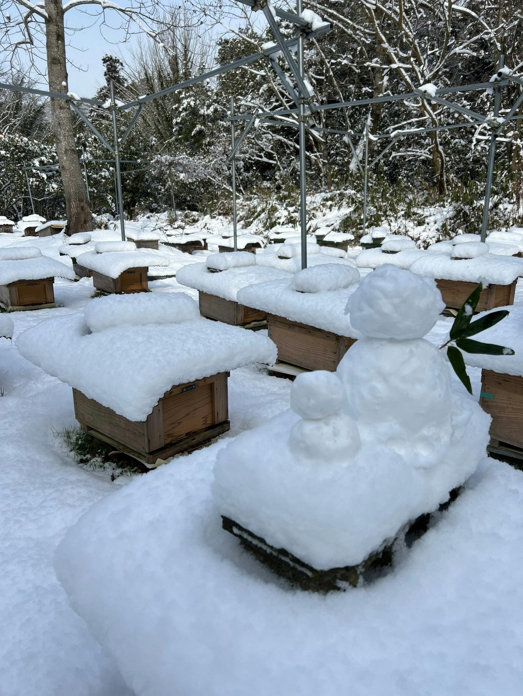 皆さま大寒波の中、いかがお過ごしでしょうか!?この度、本当に多くのご支援をいただき、本当にありがとうございます!おかげさまで、ネクストチャレンジも達成できそうな勢いです!このプロジェクトも、いよいよあと3日です!ぜひ、ラストスパートで拡散シェアをいただけますととてもうれしいです!^^さて、私たちがミツバチと共に活動している、ここ谷合の地、山口市仁保は、夜間に降り続いた雪が、膝元まで積もりました。社員たちで、直売所の駐車場へお客様が入れる程度に雪かきをし、なんかアナ雪でみたことあるようなものができておりましたが、(笑)本日も雪の中、多くのお客様にご来園いただきました。一気に暖かくなるということで、非常に遅れている梅の花の開花ももう間もなく!越冬を終えたミツバチたちが、花へめがけて一気に活動を始めます。なので、ミツバチがしっかり受粉してくれるはずなので、今年は梅は豊作になる予感!当園のミツバチたち、激減してしまいましたが、残ったミツバチたちが、力を振り絞り、健気に春を待ち望んでいます。我々も、この残ったミツバチたちと再起を目指し、日本の食と環境を守るため、踏ん張ってまいります!!引き続き温かいご支援のほど、よろしくお願いいたします!!ときつ養蜂園一同