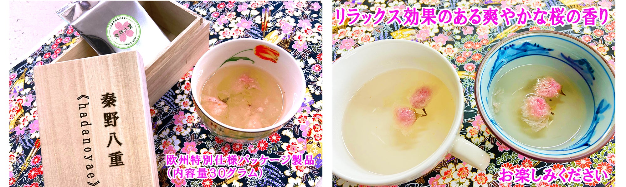 桜の香りの主成分である「クマリン」は、ポリフェノールを凌ぐ抗酸化性と抗菌性を有し、解毒作用も確認されています。桜のエキスにはリラックス効果や美容効果(美白、美肌)が含まれており、ストレス社会に生きる現代人にとって、就寝前のリラックスタイムや心身を落ち着かせたい時に、「秦野八重(hadanoyae)」を手軽に楽しむことができます。