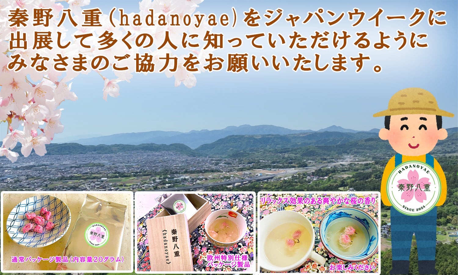 秦野八重(hadanoyae)を国内外に展開し、得られた収益を秦野の八重桜農家に還元することで、高齢化や後継者問題に取り組み、秦野市の地域活性化に寄与して参ります。