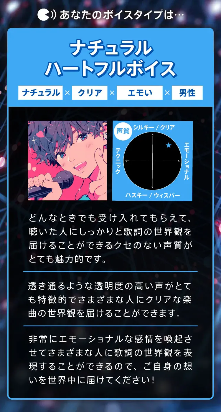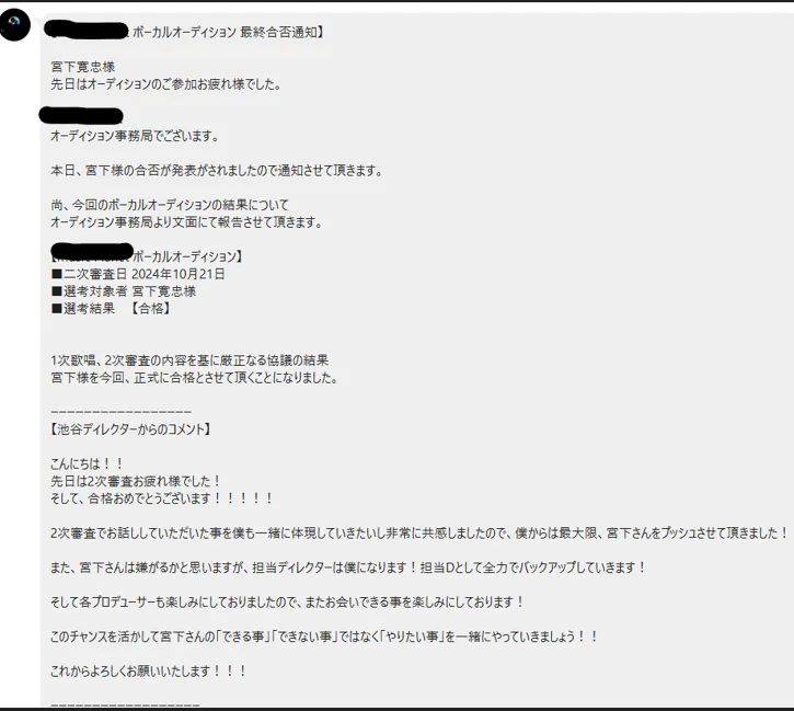 「経営コンサルタントでありながら歌う」という意外性に注目していただき、ディレクターさんから「デビュー後のマーケティングが面白くなりそう」と後押しをいただいたこともあり、このプロジェクトに参加させていただくことになりました。さらに、2次審査でも僕の経歴やこれまでの経験に興味を持ってくださるプロデューサーさんから応援をいただき、次のステージへと進むことができました。皆さんと一緒にワクワクするプロジェクトを作っていきたいと思っています。