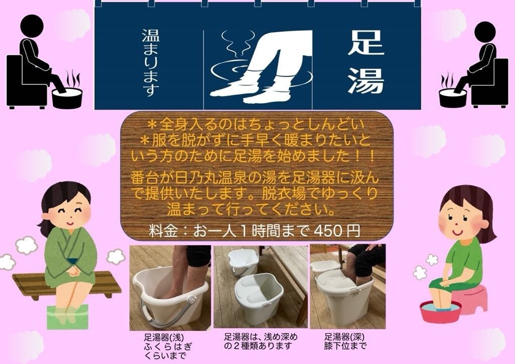 温泉に全身浸かるのは難しいけど温まりたい!温泉入りたいけど今日は着替え持ってきてない!鳥取砂丘を歩いて足が疲れた!そんな方々のために"足湯"始めました。足湯器の中に温泉の湯を汲んで脱衣所にてくつろぎながら入って頂けます。是非鳥取市に来られた際には日乃丸温泉をご利用ください!