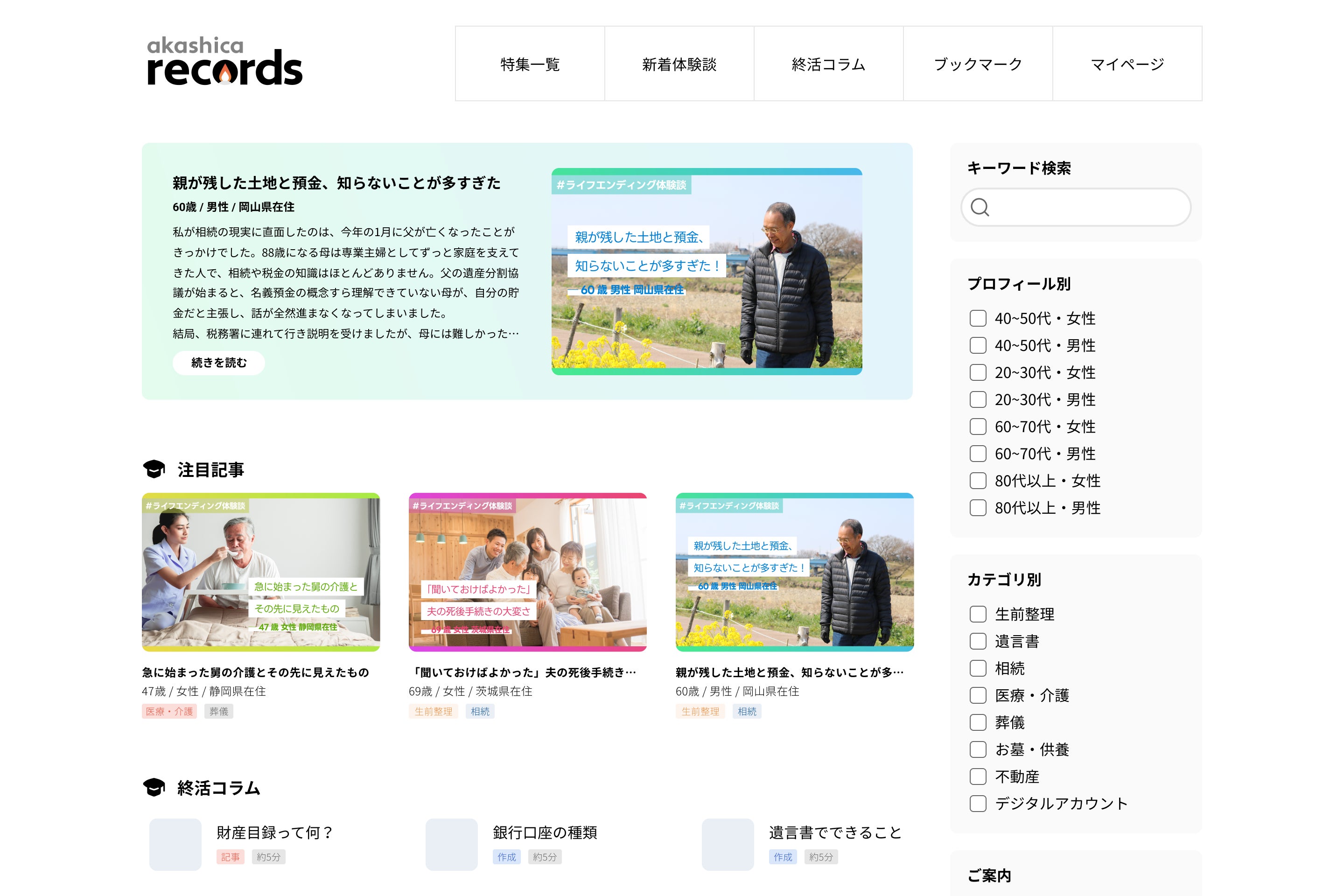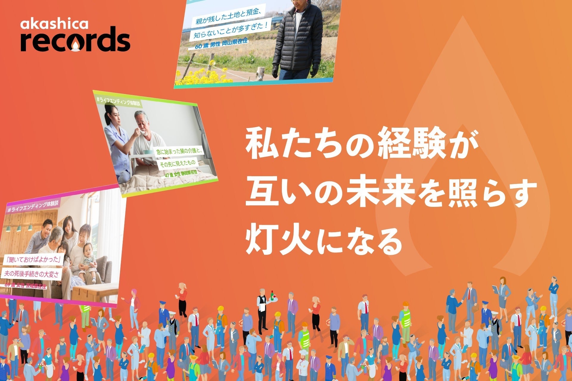 ライフエンディング領域は専門性が高く、売り手と買い手の間の情報の非対称性が大きいため、問題を引き起こすことが少なくありません。さらにその失敗談などは近しい間柄で共有されるのみで、Webで検索しても適切な情報を見つけることは困難です。そこで『アカシカレコーズ』は、ライフエンディングにまつわる様々な体験談とそこから得られる知見を社会に開き、誰もが必要な情報を簡単に取得できる環境を整えます。