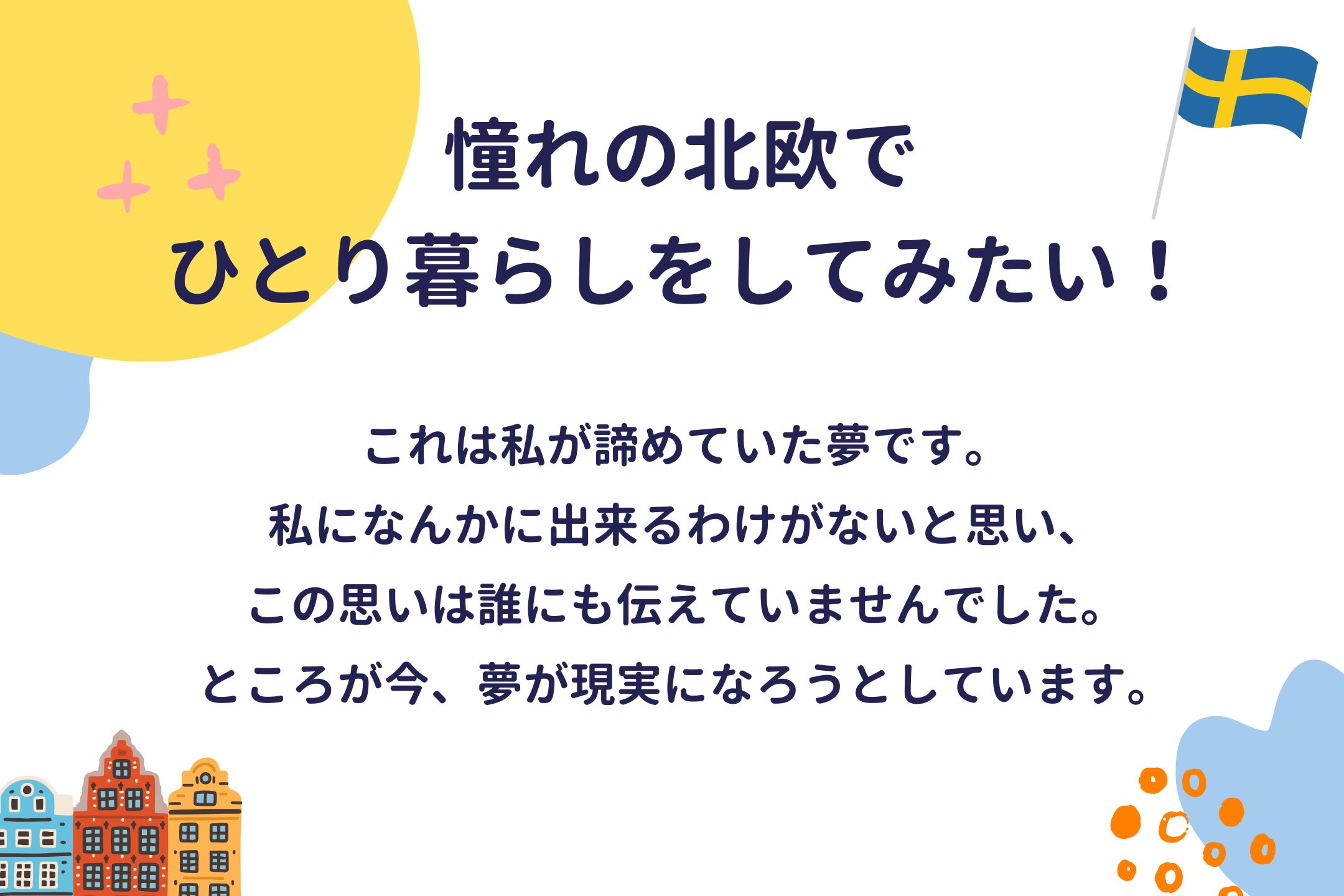 ぜひ、私の憧れの北欧でひとり暮らしをしてみたいという夢の実現を応援してください。そして、私にもあなたが夢の実現に向けて動き出すお手伝いをさせてください。