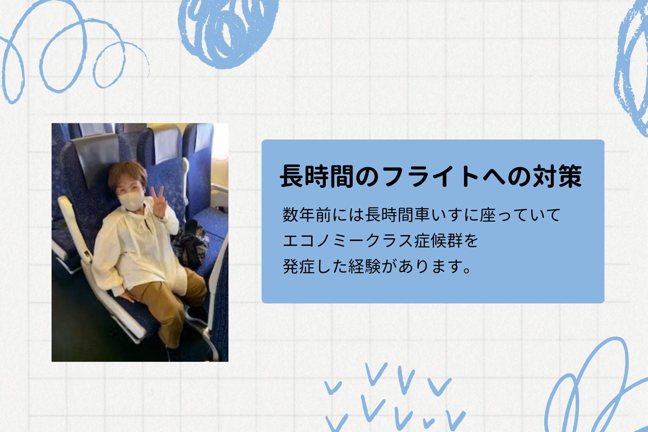 数年前には長時間車いすに座っていてエコノミークラス症候群を発症した経験があります。