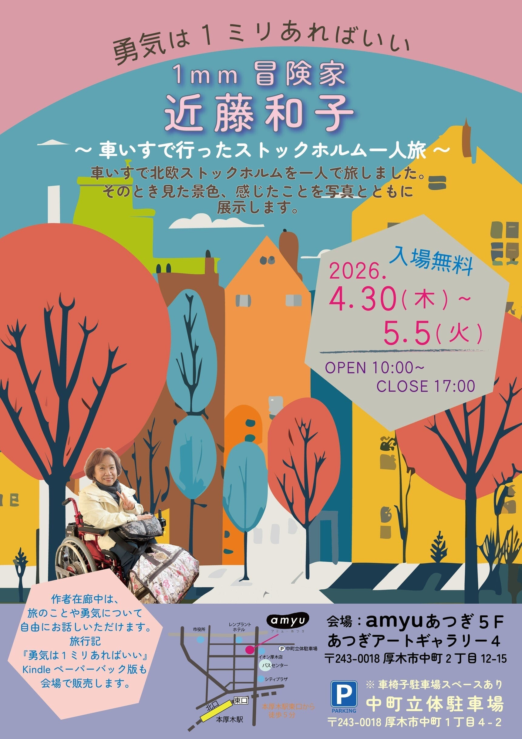 2026/04/14 12:54写真展開催のお知らせこのたびはクラウドファンディングでのご支援、本当にありがとうございました。皆さまの応援のおかげで、写真展の開催準備が順調に進んでいます。そしていよいよ、ゴールデンウィークに写真展を開催することになりました。写真展について「勇気は1ミリあればいい〜車いすで行ったストックホルム一人旅〜」ストックホルムでの一人旅で出会った景色や出来事を、写真とともに展示します。今回の展示では、写真を見るだけでなく、旅のエピソードやそのとき感じたことなども、直接お話しできる場にしたいと考えています。展示内容・写真展示・動画のエンドレス上映・書籍『勇気は1ミリあればいい』の紹介・販売・ストックホルムで購入したシロップを使ったドリンクコーナー(セルフサービス)ゆっくり過ごしていただける空間づくりを進めています。開催概要■会場あつぎアートギャラリー4(アミューあつぎ5階)■期間2026年4月30日(木)〜5月5日(火)■時間10:00〜17:00■入場無料今回の写真展は、皆さまのご支援があったからこそ実現できたものです。改めて、心より感謝申し上げます。当日は私も在廊し、皆さまと直接お話しできることを楽しみにしています。もしご都合が合いましたら、ぜひ会場にお立ち寄りいただけましたら嬉しいです。引き続き、どうぞよろしくお願いいたします。 もっと見る