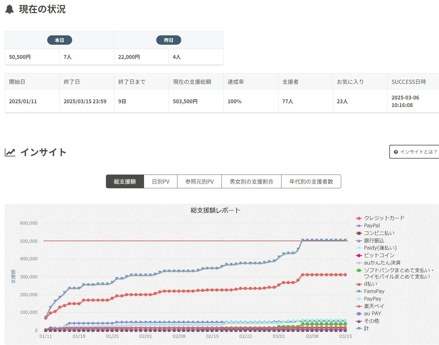 現在の支援総額は 503,500円(100%達成)、支援者数は 77名 となり、クラウドファンディングが成功しました。今日だけで 50,500円・7名の方 からのご支援があり、皆さんの温かい応援が大きな力となりました。