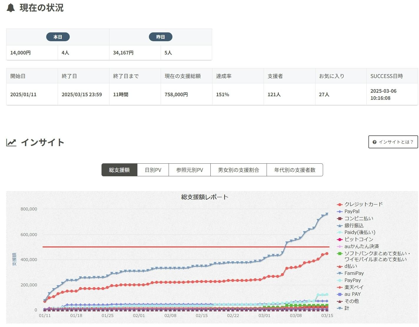 現在の支援総額は758,000円です。皆様の温かいご支援のおかげで、目標金額を大きく超え、達成率151%となりました。 支援者数は121人に達し、たくさんの応援をいただき本当に感謝しています。