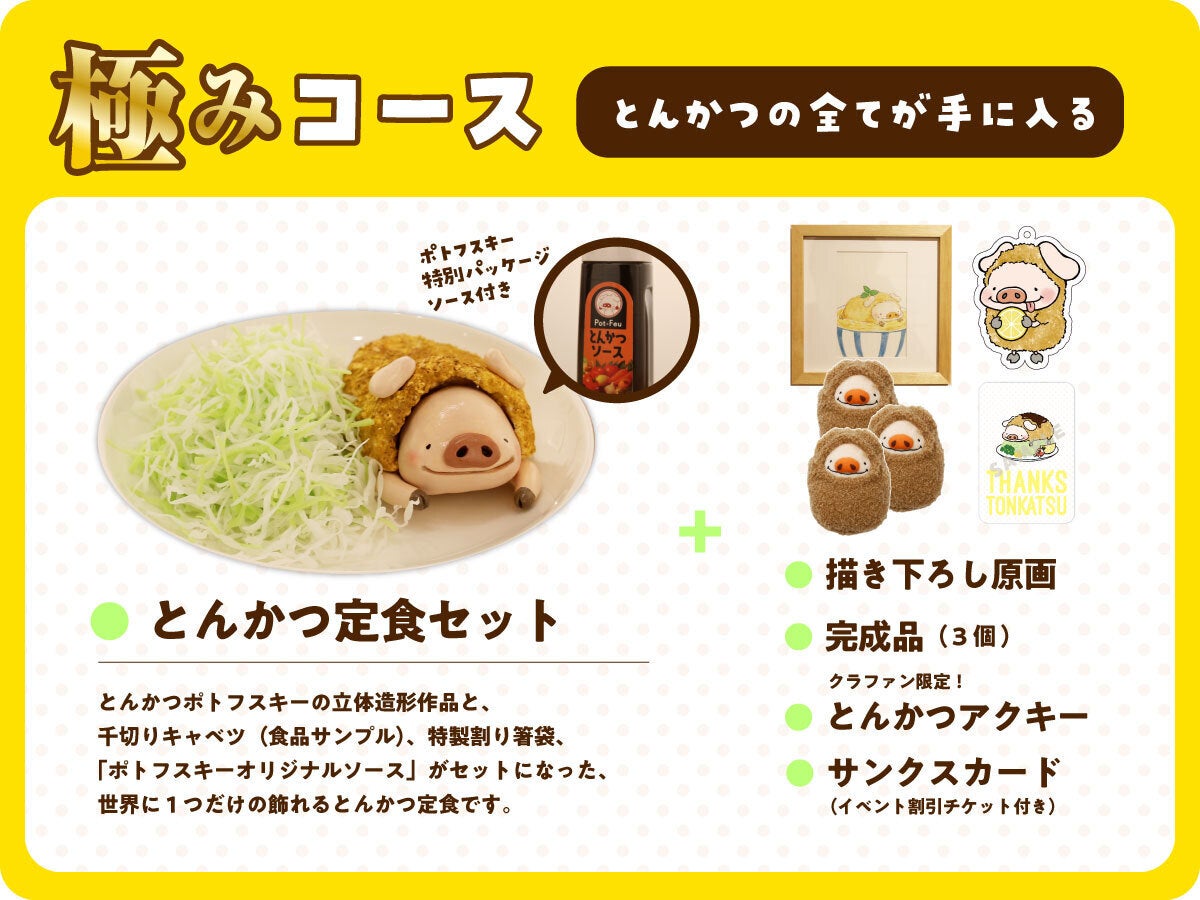 「極みコース」にはとんかつポトフスキーの立体造形作品と、千切りキャベツ(食品サンプル)、特製割り箸袋、「ポトフスキーオリジナルソース」がセットになった、世界に1つだけの飾れるとんかつ定食をご準備いたしました。他のリターン品と合わせ、油にまみれたとんかつ天国をご堪能いただけます。お腹も心も満たされる?スペシャルコースです。
