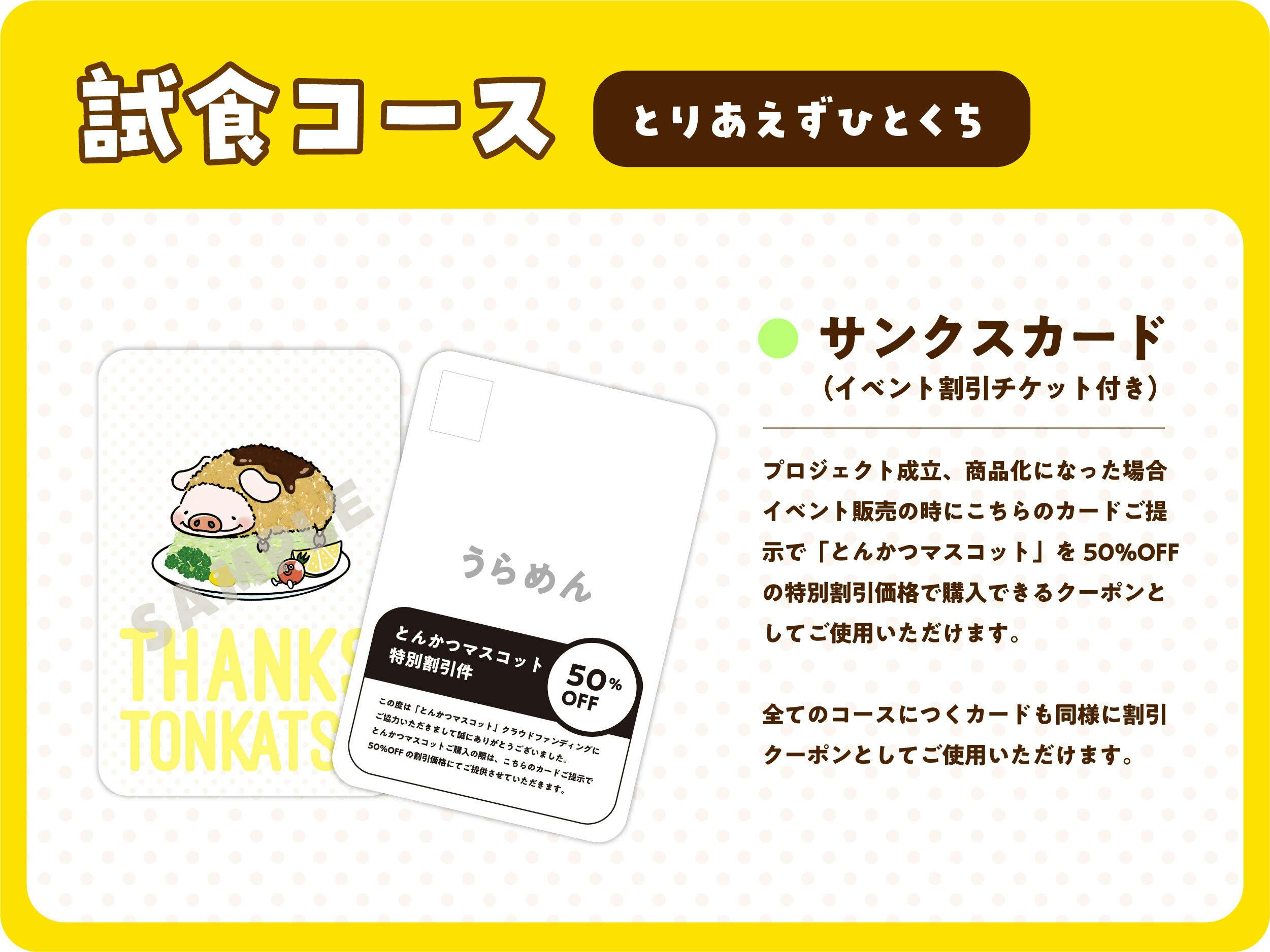 こちらのカードを作者が出店するイベント会場へご持参いただくと、会場にて販売している「とんかつマスコット」を50%OFFの価格で購入できるクーポンとしてご使用いただけます。(割引は他のコースに付く全てのカードに適応されます)※有効期限は2026年12月末まで