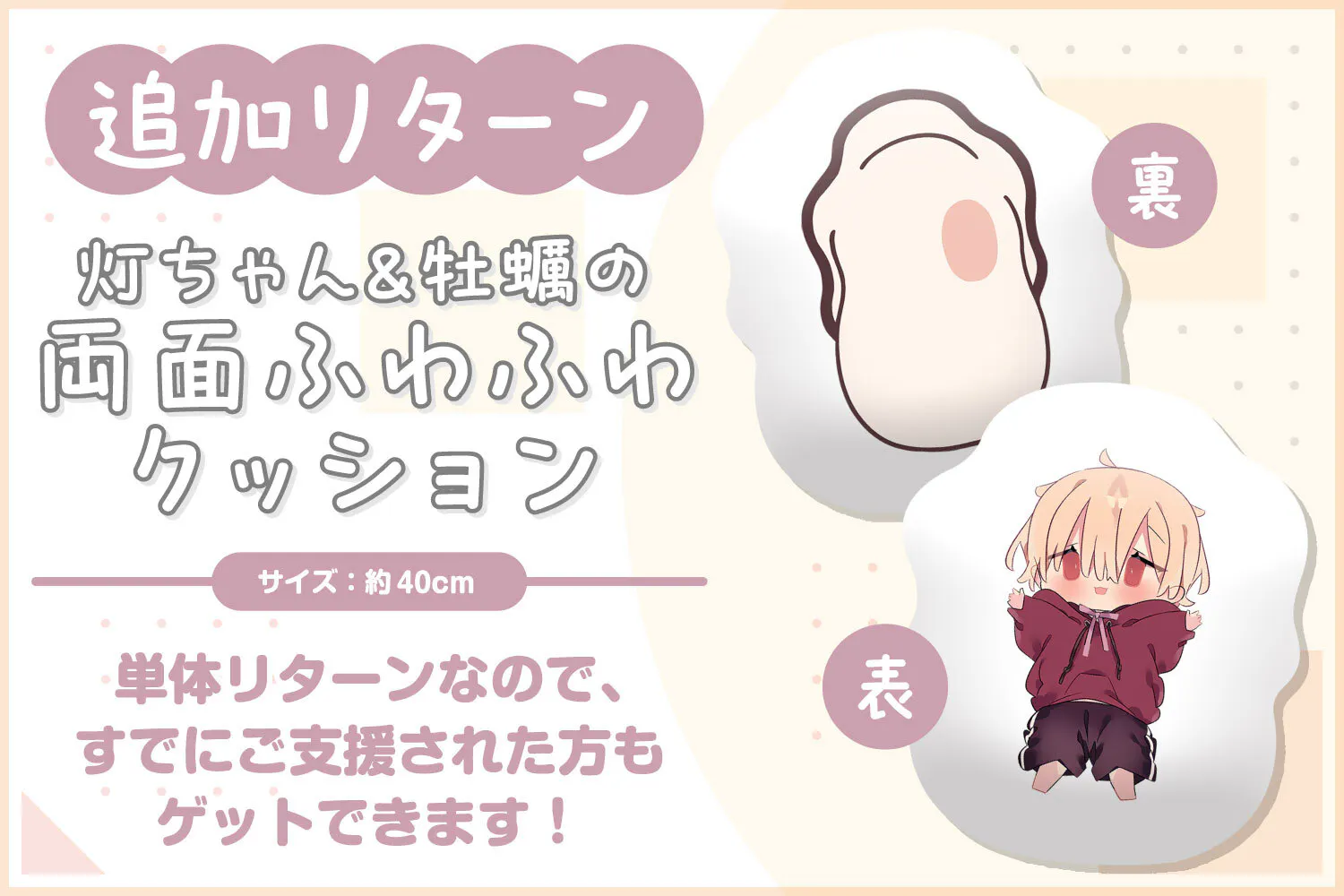 2024/12/05 19:00Creationスタッフです。灯ちゃんぬいぐるみ化プロジェクトへのご支援ありがとうございます!目標達成まであと少し...!ということで新たなリターンを追加しました!灯ちゃんと牡蠣のふわふわクッションが登場!表と裏でどちらも楽しめちゃいます♪すでにご支援された方もゲットできますので、ぜひこの機会をお見逃しなく!目標金額達成のために、応援よろしくお願いします! もっと見る
