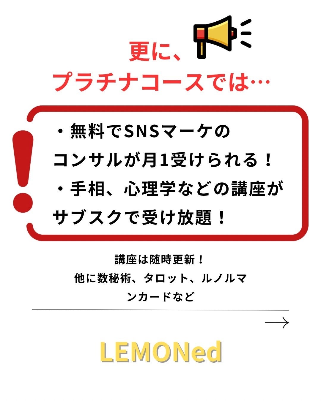 2025/01/22 08:00悩みを抱える人が救われ、占い師が輝ける場所。それが「LEMONed(レモネード)」です。1月23日をもって、クラウドファンディングが終了します。このプロジェクトを支援する最後のチャンスに、ぜひご協力ください。「LEMONed」に込めた願い LEMONedは、悩みを抱える人たちが占い師との出会いを通じて「悩み」を「不要なもの」に変えられる場所を目指しています。「LEMON」という言葉には英語で「役に立たないもの」というスラングの意味があり、そこに過去形の「ed」をつけることで、「悩みがもう不要になった」という願いを込めています。占いをもっと身近に、もっと気軽に頼れるものとして提供したい。それがLEMONedの本質です。さなえの想い:占い師として、マーケターとして LEMONedを立ち上げた代表・さなえには、強い思いがあります。「実力のある占い師が集客に悩み、埋もれてしまうことが本当に悔しかった。」多くの占い師が持つ悩み——「集客が苦手」「相談できる仲間がいない」——を解決し、占いに集中できる環境を作りたい。そして、悩みを抱える方々に「占い」という頼りやすい手段をもっと広めたい。これらを叶えるために、このプロジェクトが生まれました。すべての人が「ご縁」でつながる場所 LEMONedは「占い師」と「悩む人」がつながるだけではなく、ご縁の輪がどんどん広がり、明るい世の中を目指しています。悩みを抱える人が占い師との出会いで救われる。そして占い師もまた、多くの人々とのつながりの中で悩みから解放される。この相互の救済を、LEMONedは願っています。クラウドファンディング終了まであと1日!LEMONedの実現には、皆さんの力が必要です。支援してくださった方には以下のような特典をご用意しています。さらに、LEMONedはただの「占いのマッチングサイト」ではありません。誰かの悩みが解消され、明るい未来が広がる「ご縁の架け橋」なのです。あなたもLEMONedの輪に加わりませんか?支援の最後の一押しが、このプロジェクトを実現させます。最終日23日19:00よりインスタで生中継 今回の企画運営に携わり、今後のLEMONedの看板占い師が集まり実況中継します。「占い師の人柄がわからないし、支援に悩んでいる」という方、必見です!※出演者のアカウントをフォローし通知を受け取ってください●さなえsanae_tarot_79●あまなamana_uranai165●うめこumeko.tarot●のどかnodoka_3rdring明るく優しく温かく。一緒に未来に進みたくなる占い師の、アットホームなLIVEになることでしょう。未来に悩みを持たない明るい社会を、LEMONedとともに創りましょう。あと1日。支援をお待ちしています! もっと見る