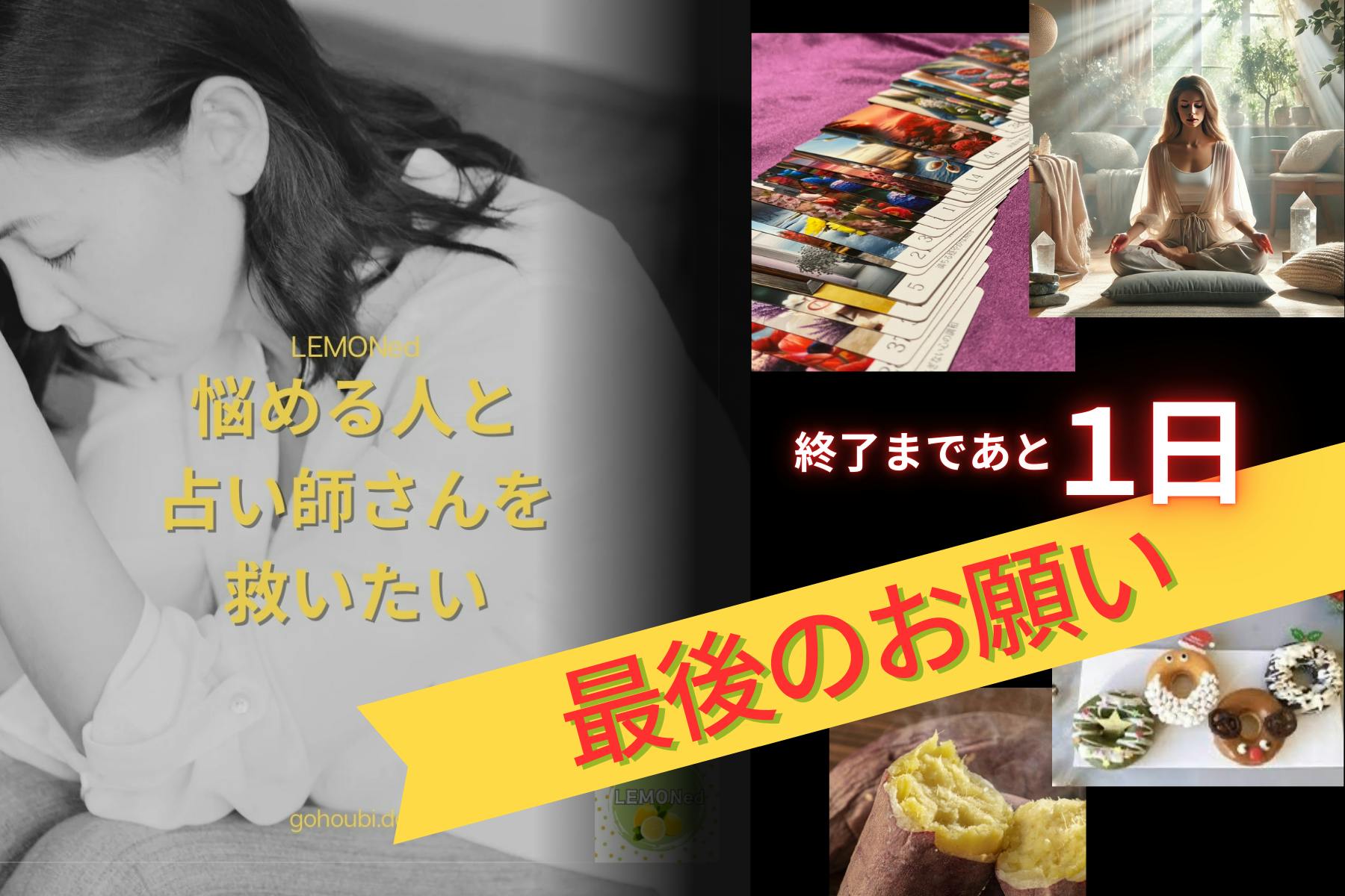 2025/01/22 08:00悩みを抱える人が救われ、占い師が輝ける場所。それが「LEMONed(レモネード)」です。1月23日をもって、クラウドファンディングが終了します。このプロジェクトを支援する最後のチャンスに、ぜひご協力ください。「LEMONed」に込めた願いLEMONedは、悩みを抱える人たちが占い師との出会いを通じて「悩み」を「不要なもの」に変えられる場所を目指しています。「LEMON」という言葉には英語で「役に立たないもの」というスラングの意味があり、そこに過去形の「ed」をつけることで、「悩みがもう不要になった」という願いを込めています。占いをもっと身近に、もっと気軽に頼れるものとして提供したい。それがLEMONedの本質です。さなえの想い:占い師として、マーケターとしてLEMONedを立ち上げた代表・さなえには、強い思いがあります。「実力のある占い師が集客に悩み、埋もれてしまうことが本当に悔しかった。」多くの占い師が持つ悩み——「集客が苦手」「相談できる仲間がいない」——を解決し、占いに集中できる環境を作りたい。そして、悩みを抱える方々に「占い」という頼りやすい手段をもっと広めたい。これらを叶えるために、このプロジェクトが生まれました。すべての人が「ご縁」でつながる場所LEMONedは「占い師」と「悩む人」がつながるだけではなく、ご縁の輪がどんどん広がり、明るい世の中を目指しています。悩みを抱える人が占い師との出会いで救われる。そして占い師もまた、多くの人々とのつながりの中で悩みから解放される。この相互の救済を、LEMONedは願っています。クラウドファンディング終了まであと1日!LEMONedの実現には、皆さんの力が必要です。支援してくださった方には以下のような特典をご用意しています。さらに、LEMONedはただの「占いのマッチングサイト」ではありません。誰かの悩みが解消され、明るい未来が広がる「ご縁の架け橋」なのです。あなたもLEMONedの輪に加わりませんか?支援の最後の一押しが、このプロジェクトを実現させます。最終日23日19:00よりインスタで生中継今回の企画運営に携わり、今後のLEMONedの看板占い師が集まり実況中継します。「占い師の人柄がわからないし、支援に悩んでいる」という方、必見です!※出演者のアカウントをフォローし通知を受け取ってください●さなえsanae_tarot_79●あまなamana_uranai165●うめこumeko.tarot●のどかnodoka_3rdring明るく優しく温かく。一緒に未来に進みたくなる占い師の、アットホームなLIVEになることでしょう。未来に悩みを持たない明るい社会を、LEMONedとともに創りましょう。あと1日。支援をお待ちしています! もっと見る