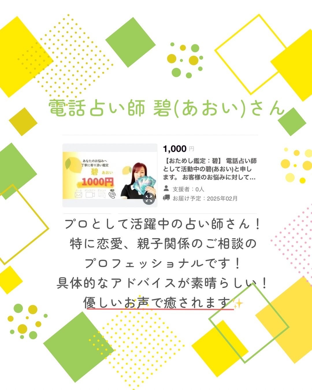 活躍中のプロ占い師の碧さん。恋愛や親子関係のご相談が得意で、具体的なアドバイスをしていただけます。【優しいお声】で癒される電話占いです。