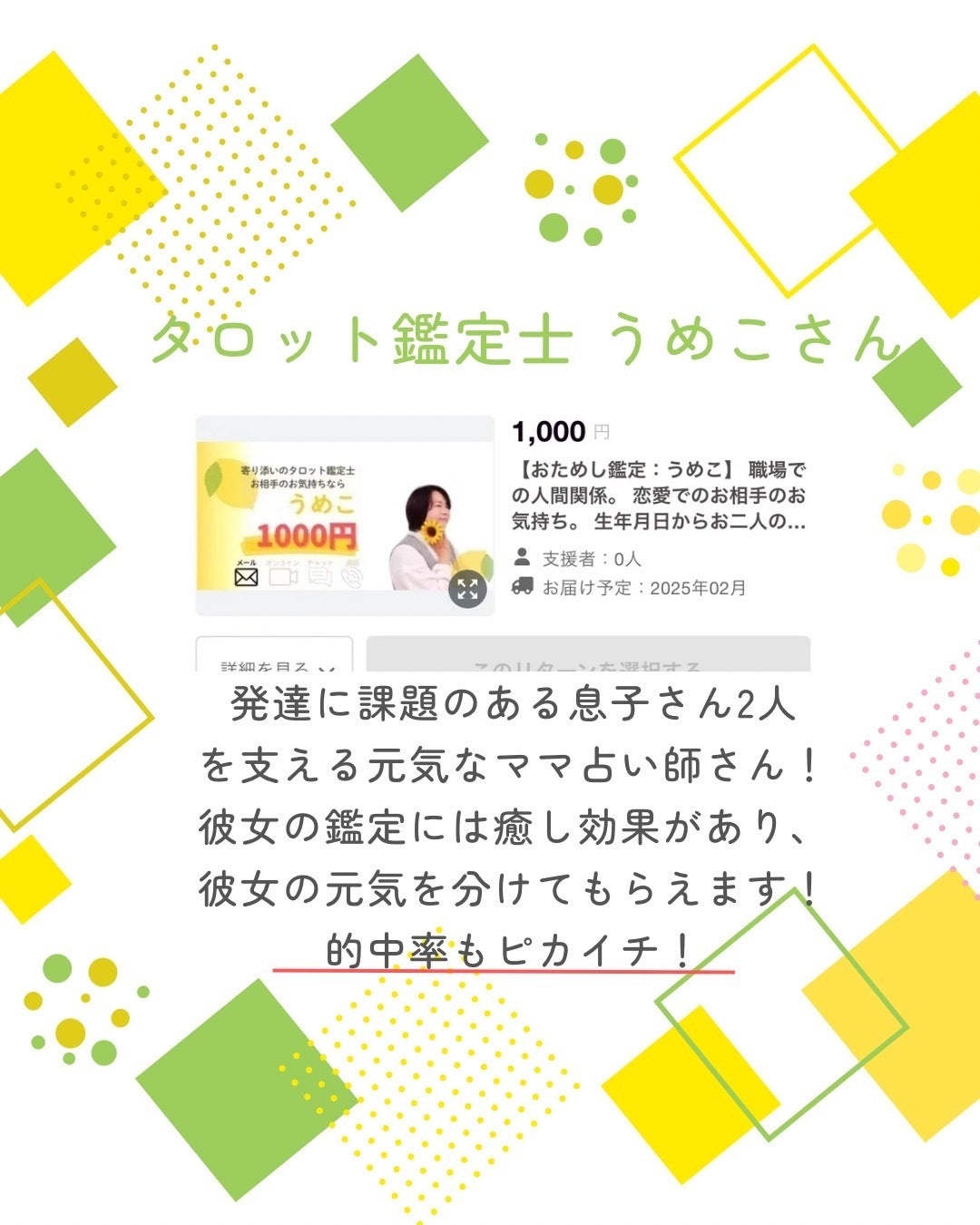 発達に課題のある息子さん2人を支える元気なママ占い師さん。エネルギッシュな中にある優しさから鑑定を受けると癒しももらえます。【的中率も非常に高い】です!