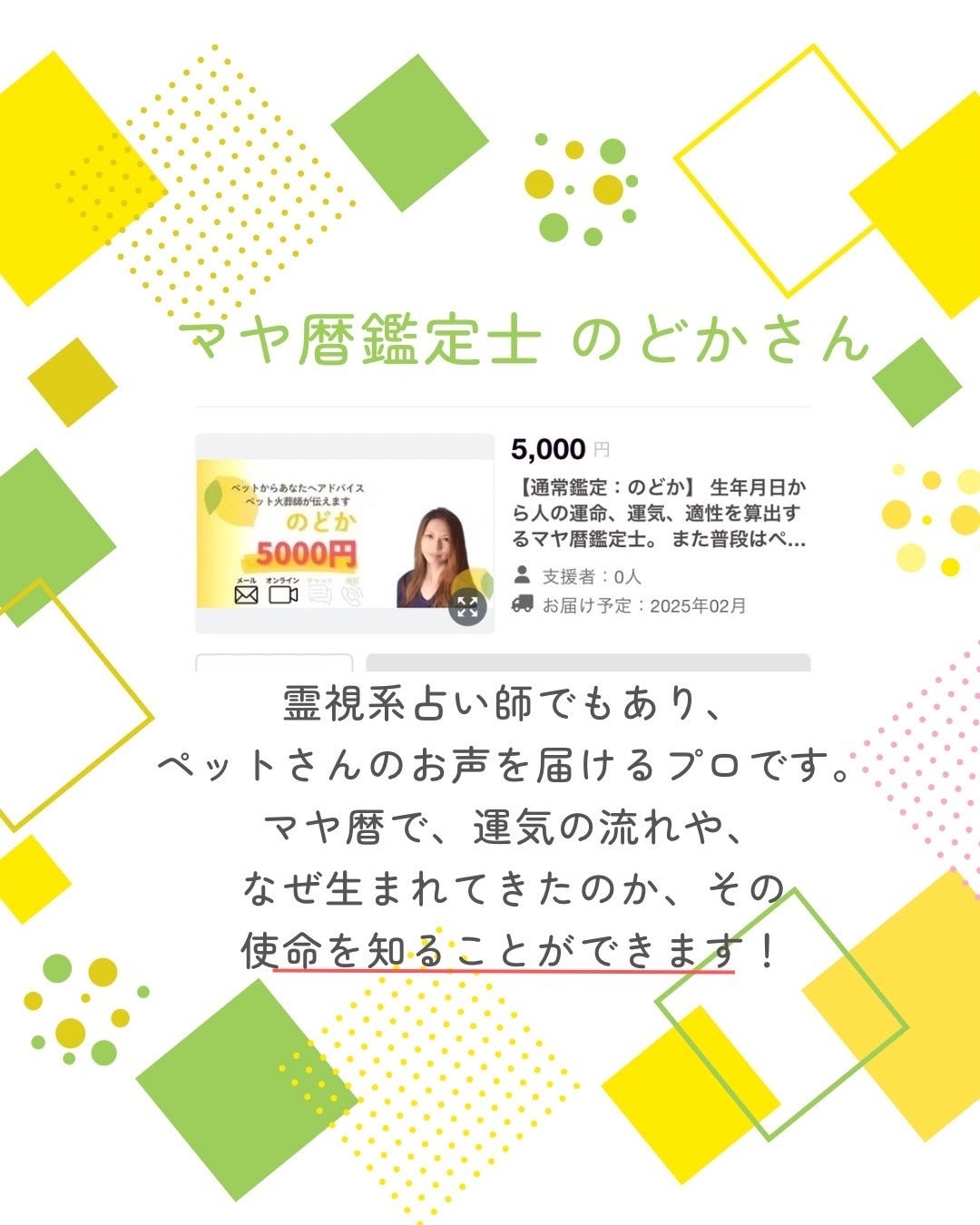 霊視系占い師ののどかさん。【ペットの声】を届けるプロで、日ごろから動物の命・魂に寄り添っています。メイン占術はマヤ暦で、運気の流れや自分の生まれた使命をお伝えします。
