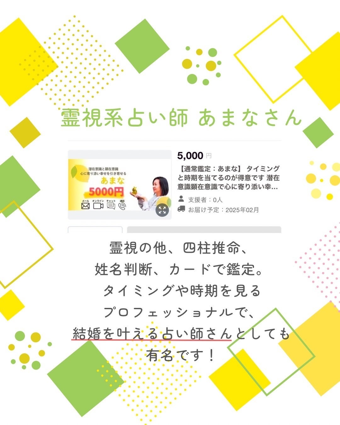霊視、四柱推命、姓名判断、カードを用いて鑑定するあまなさん。タイミングや時期をみるプロフェッショナルで、【結婚を叶える占い師】として有名です。