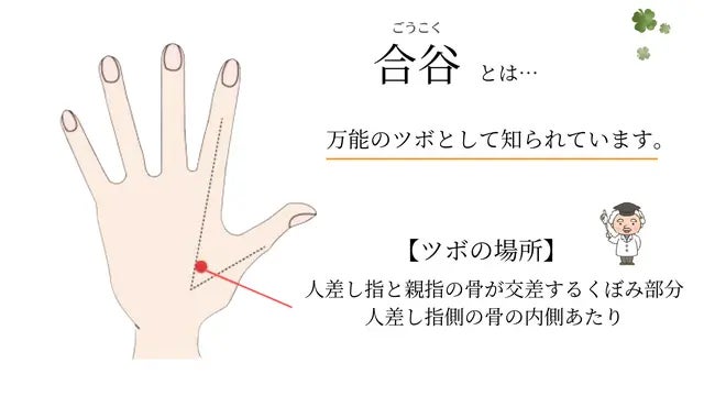 合谷(ごうこく)部分のコリがひどい方は刺激が強すぎる場合がございます。