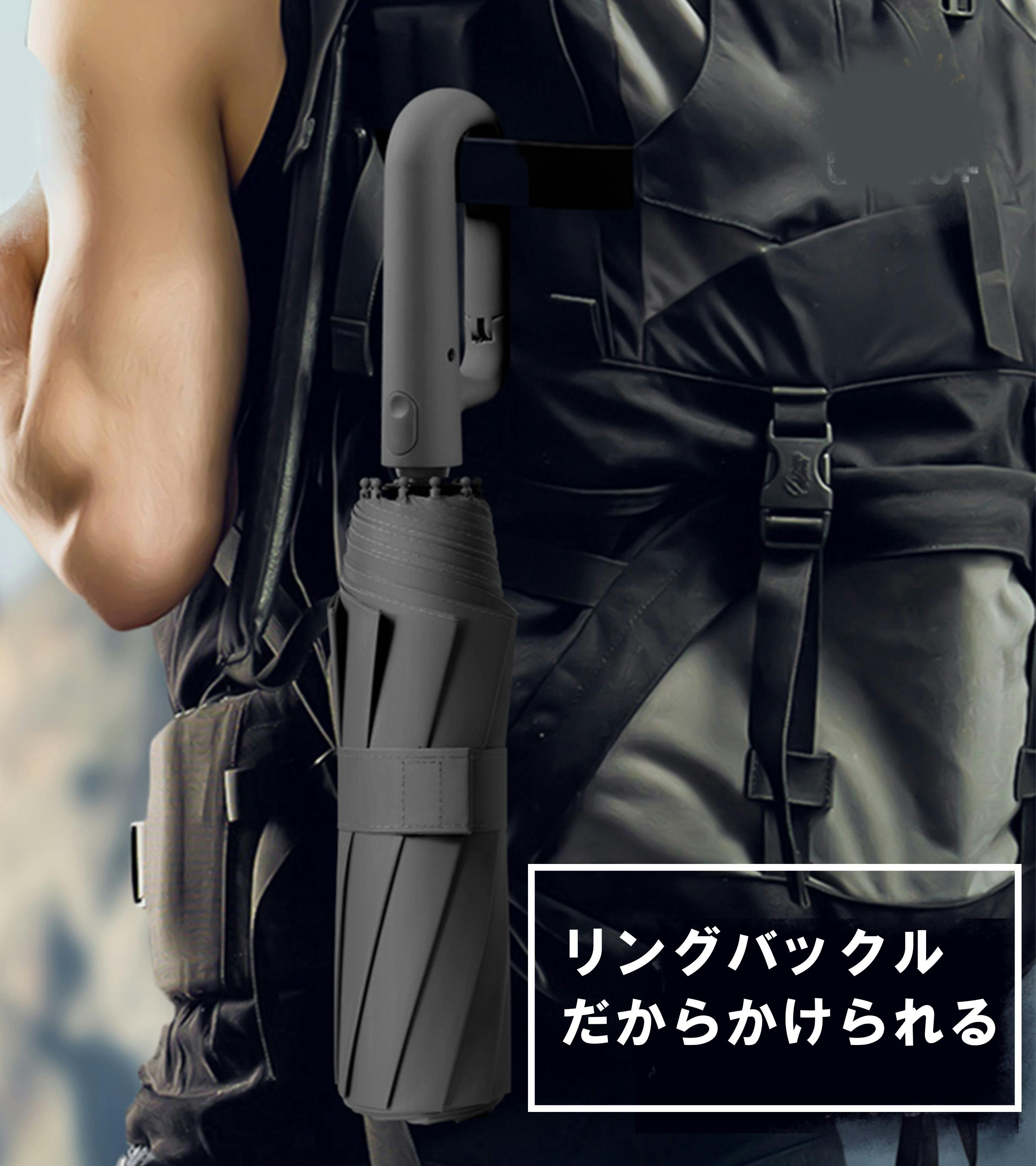 A. 傘の持ち手部分に取り付けられたフックを使用して、リュックやトートバッグなどのストラップ部分に簡単に引っ掛けることができます。両手が自由になるため、移動時にも便利です。