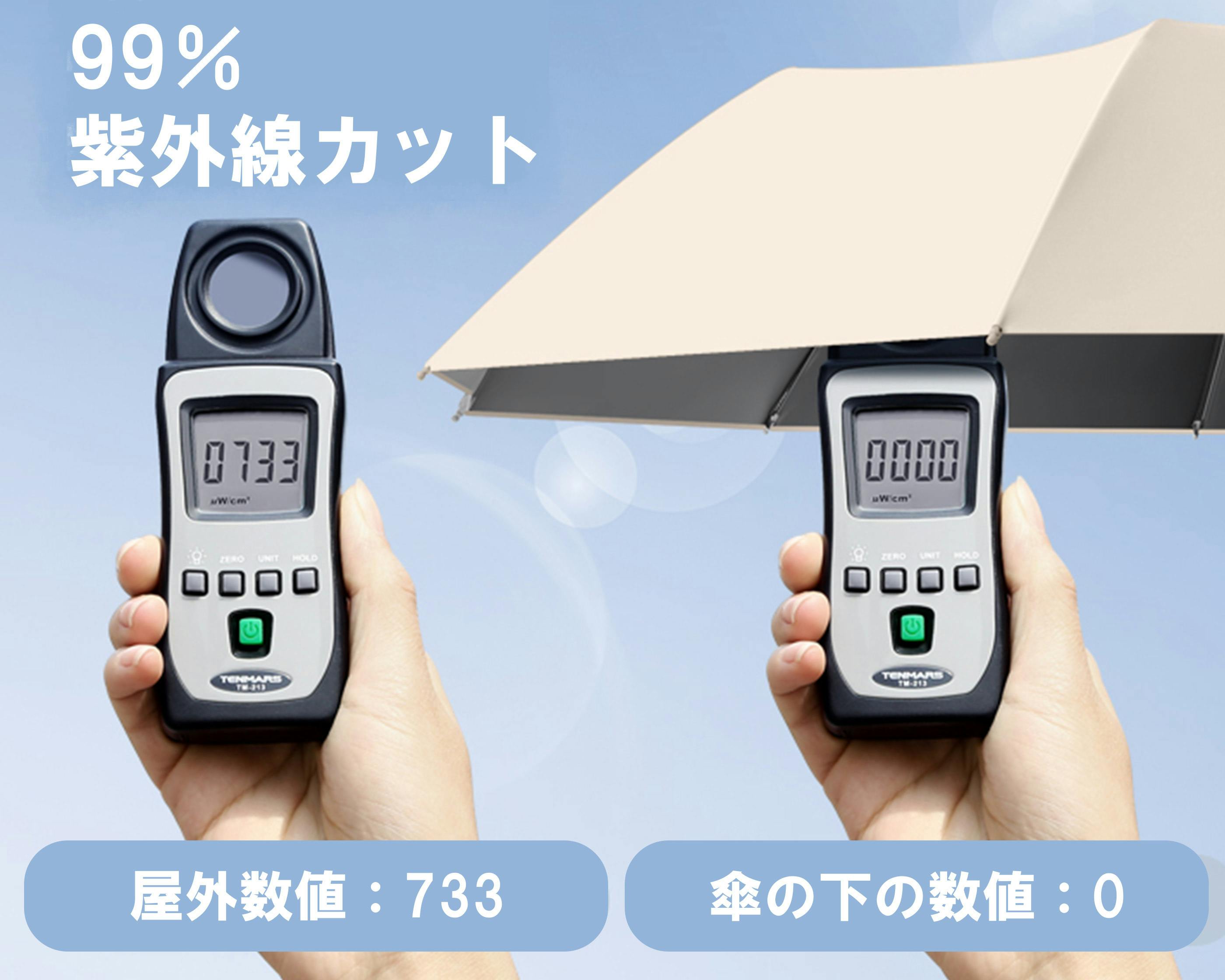 UPF50+の日傘に使用は、同じ太陽光の下で肌に紫外線による影響が出るまでに50倍以上の時間がかかることを意味します。たとえば、日本の真夏で20分間で肌が赤くなり日焼けすると想定した場合、UPF50+の日傘は20分間の50倍、約17時間もの間、日焼けから肌を守ってくれると言われています。