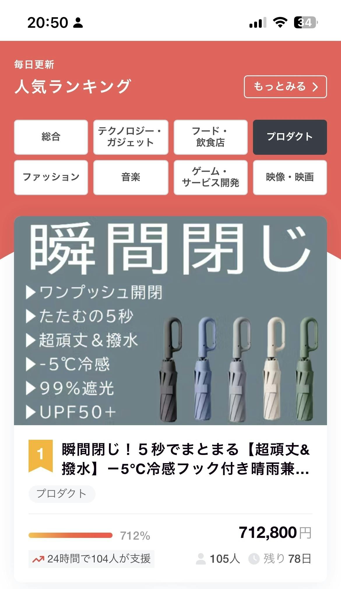 瞬間閉じ折り畳み傘 目標達成しました。ありがとうございます。広報担当 上から読んでも下から読んでも平一平(たいらいっぺい)です。光の速さで目標達成しましたね。まだまだプロジェクトは始まったばかりです。これからもご支援、応援宜しくお願します。皆さまのご支援に心から感謝申し上げます。これからクラファン終了に向けて一層努力してまいります。引き続き、進捗情報をお届けしますのでご期待ください。