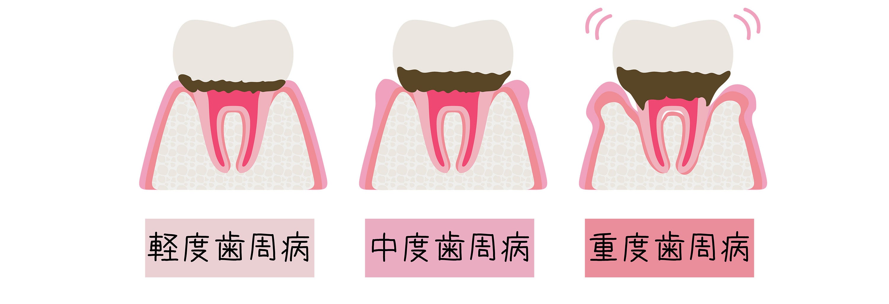歯垢の中の歯周病原菌によって歯茎に炎症が起こり、歯を支える骨を溶かして歯がグラグラしたり抜けてしまったりする病気です。