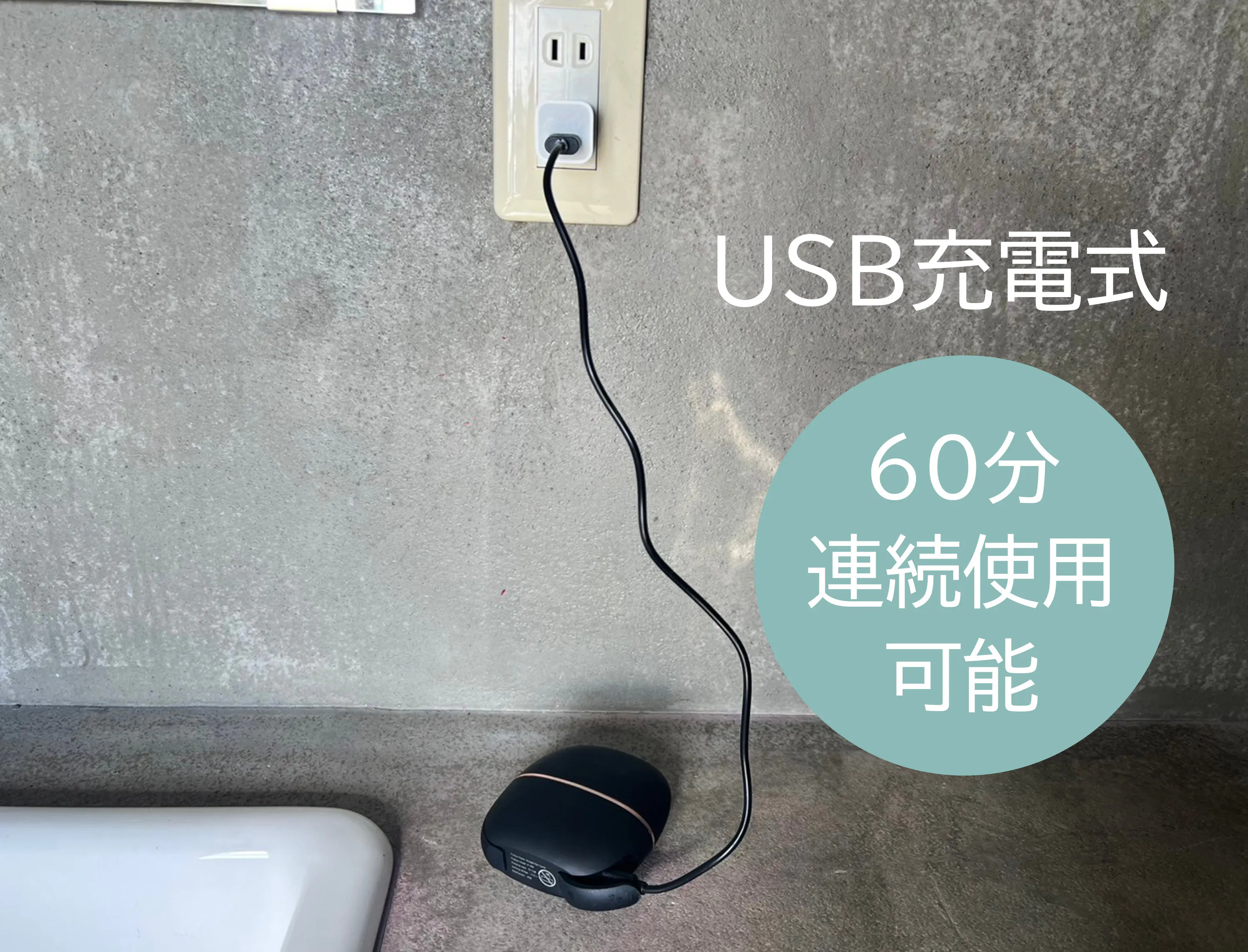 電池が不要の充電式を採用しました。充電はうれしいUSB充電。フル充電で約60分使用可能です。