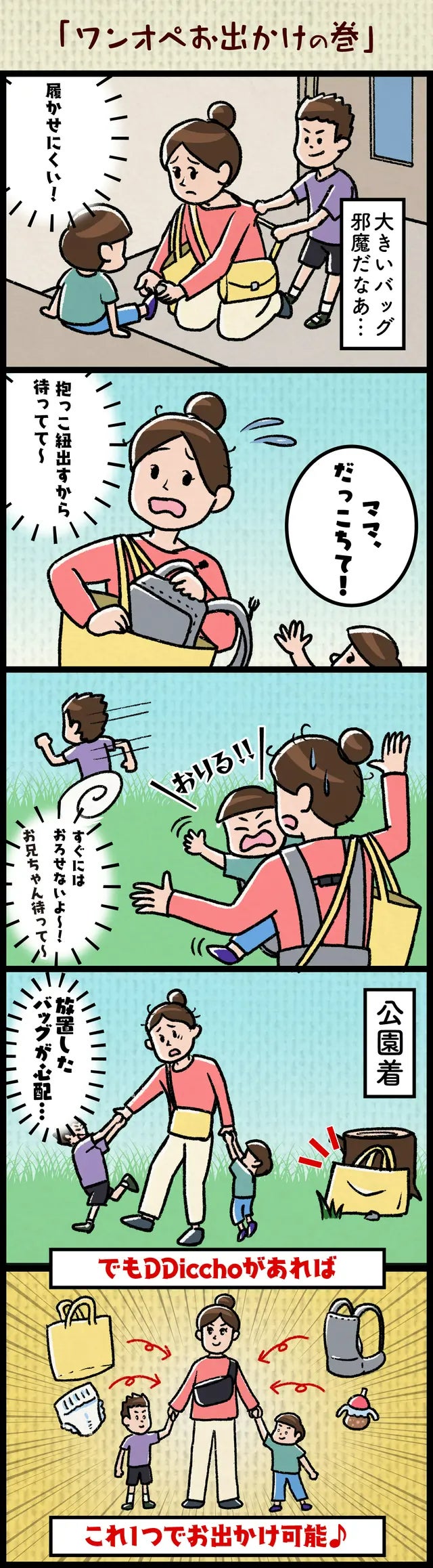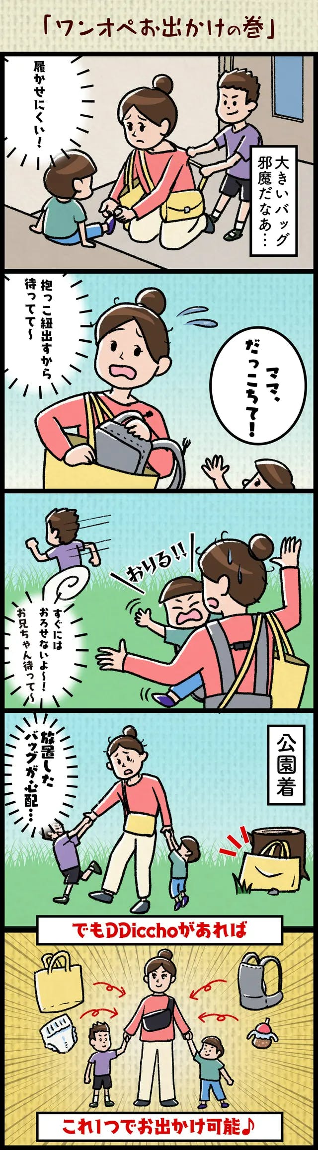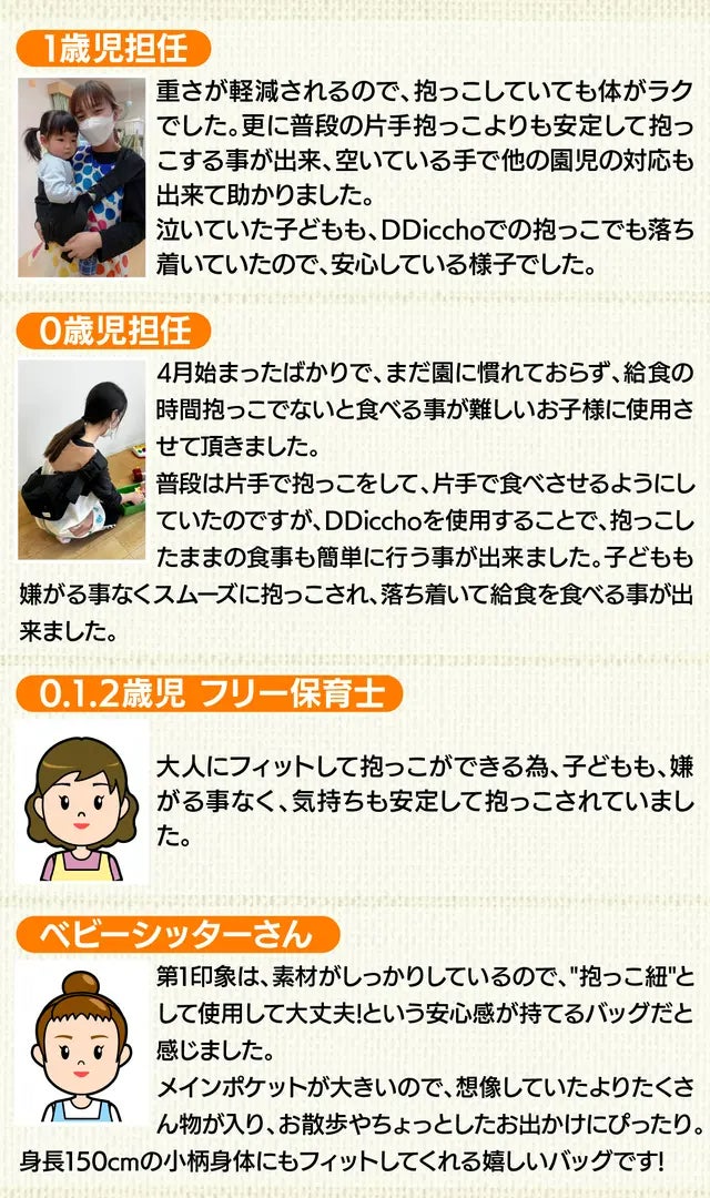 このお悩みを解決すべく、保育士×ママが1年以上の試行錯誤のもと、抱っことバッグが1つになった”DDiccho”を完成させました!!