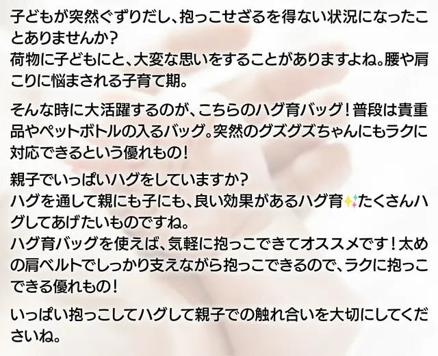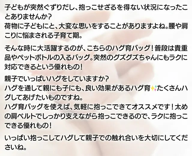また、Hugがもたらす幸福感は乳幼児期だけでなく将来の子どもや大人にとっても、重要な役割だと感じます。【Hug育バッグ DDiccho】は、抱っこされたい。抱っこしたい。が叶うように、Hugが無理なく自然に行える環境を作りだしていくことをお手伝いします。