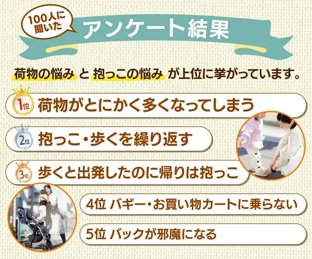 100人に聞いたアンケート結果でも、抱っこと荷物の悩みを抱える方は多いことがわかります。