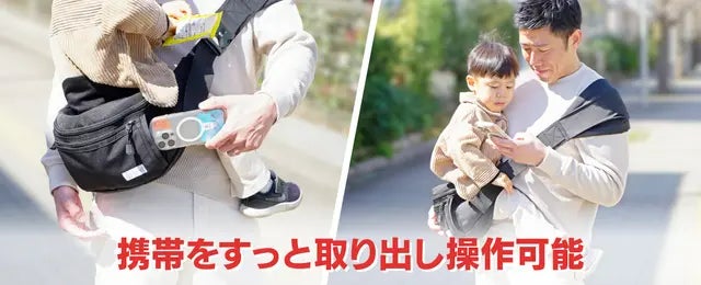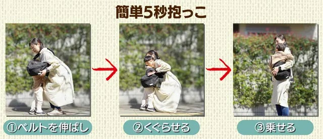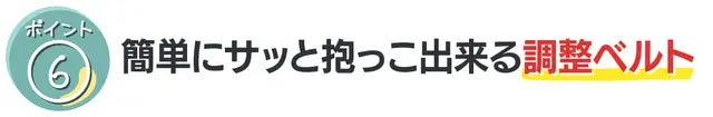 ベルトを伸ばし、子どもを抱っこした後、片手で簡単にベルトの調節を行う事が出来ます。子どもを抱っこしやすい位置まで簡単に持ち上げることが出来ます。