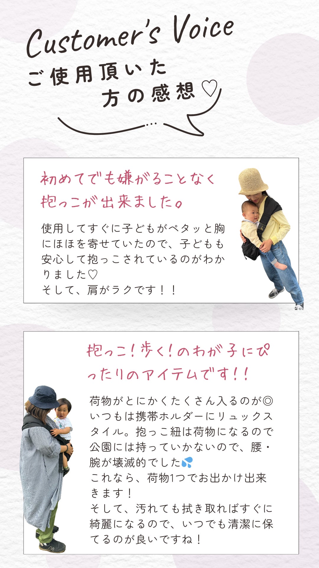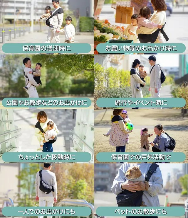 また、抱っこ以外の子育ての場面でもとても使いやすいように作り上げました。抱っこを卒業した後も末永くご使用頂けます。