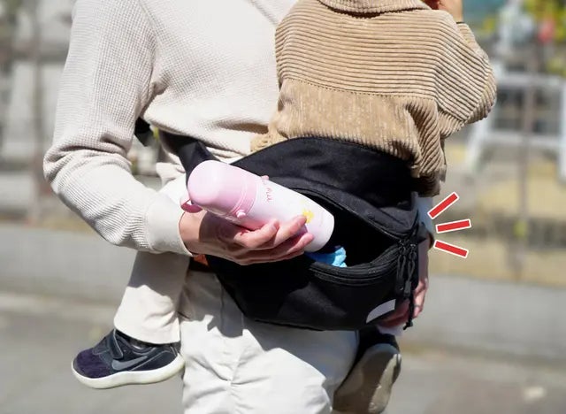 お子様がしっかり座った状態で立ち上がれるようお尻の位置とバッグの位置をご確認下さい。また、立ち上がる際には必ず、お子様の体に手を添えて抱っこをしてください。
