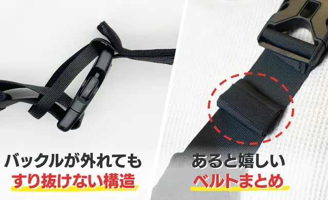 ・余ったベルトもしっかりまとめて頂くことで、ベルトがずり落ちてしまう事を防止致します。必ずまとめて頂くことをお願い申し上げます。