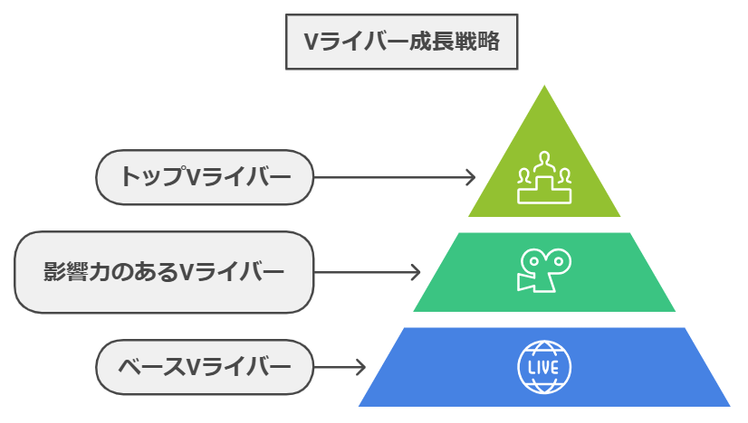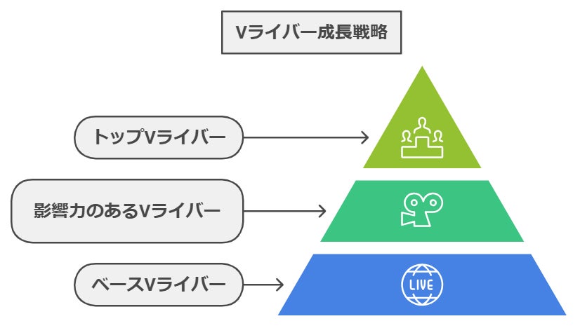 これを達成することで、多様なジャンルやスタイルを持つライバーたちが集まり、それぞれの個性を活かして活動できる場を整えます。さらに、この100人の中から、より多くのファンを獲得し、強い影響力を持つ「トップVライバー」を育成することを目指しています。その中核となるのは、フォロワー1万人以上を誇るトップライバー20人を目標としたピラミッド型の構造です。