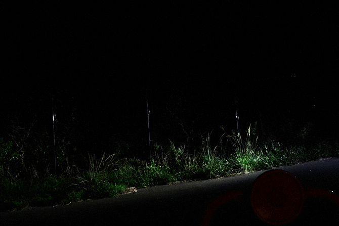 これは真っ暗な夜道で地面をスマートフォンのライトで照らしている様子です。白い靴が照らされているのが分かるかと思います。実はここには…。
