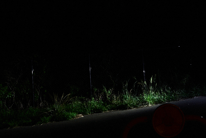 これは真っ暗な夜道で地面をスマートフォンのライトで照らしている様子です。白い靴が照らされているのが分かるかと思います。実はここには…。