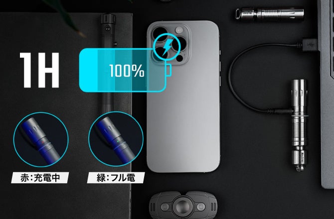 フル充電には約1時間かかります。急速充電に対応しているので、短時間で使用可能です。