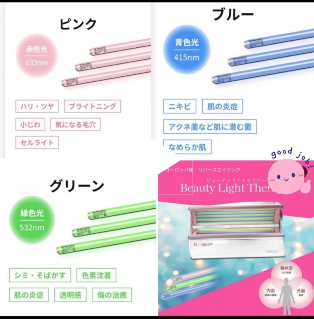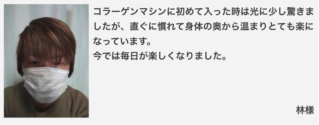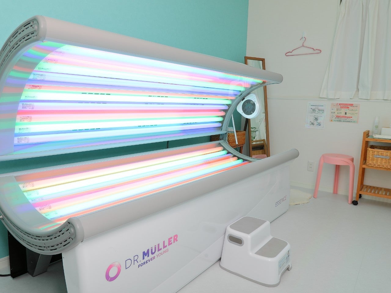 美容大国・韓国でも人気のコラーゲンマシン。当サロンのマシンの最大の特徴は、3色の光線が出ること。従来のピンクに加え、グリーン、ブルーが入りパワーアップ。20分間、3色の可視光線を浴びると、体はあっという間にポカポカに。