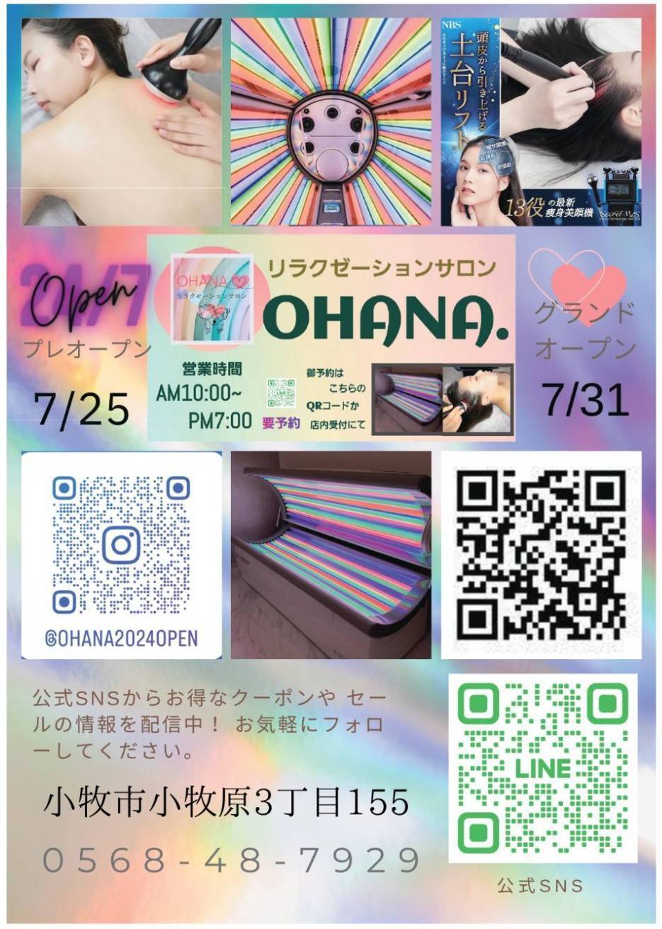 OHANA.は、名鉄小牧線の小牧原駅から徒歩9分。2024年7月31日にオープンしたばかりのリラクゼーションサロンです。