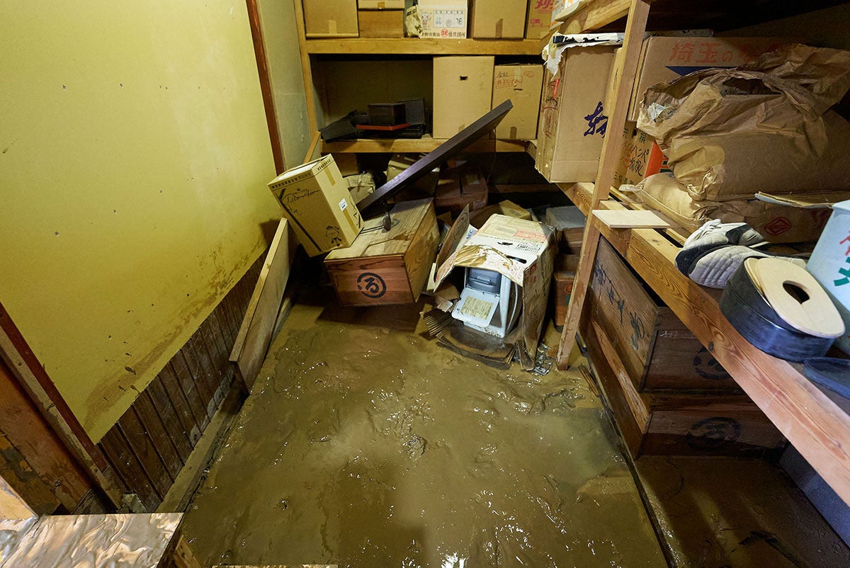 一方、1階では午前11時頃から床下の隙間からじわじわと水が上がりはじめ、畳が浮き出し、家具が流れ、あっという間に床上30㎝以上もの浸水。河川からは少し離れているにも関わらず、家中に泥水が流れ込みました。この地面から上がる水は「内水氾濫」と呼ばれ、雨量を処理しきれなくなった下水道管の影響によるものです。結果、当家のみならず地区全体が大きな水たまりになってしまいました。