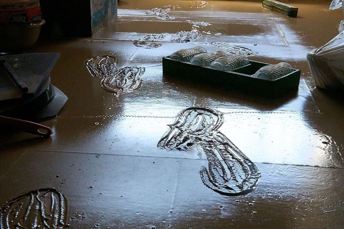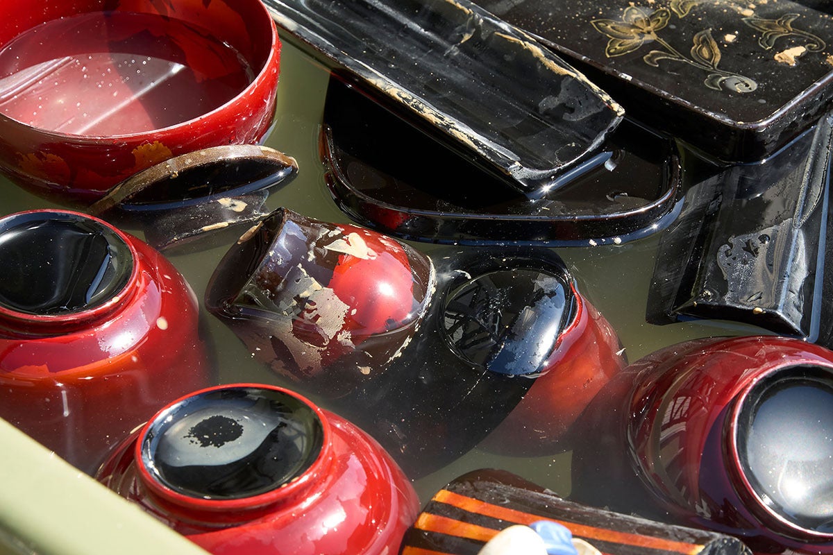 この水害によって工房にあったものの8割が被害を受けました。作業前の木地は水を含んで変形し、大切な漆も沈金に使用する金箔・金粉などの材料もすべて処分。保管庫にあった数百点に及ぶ輪島塗の被害も甚だしく、豪雨による損害は計り知れません。