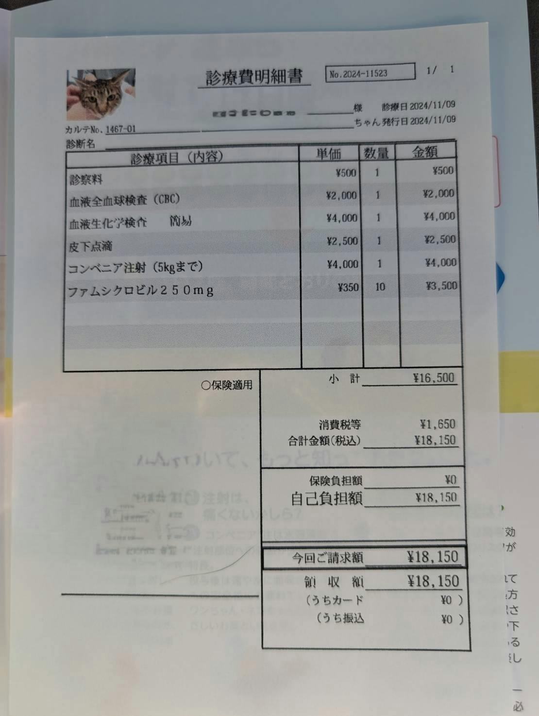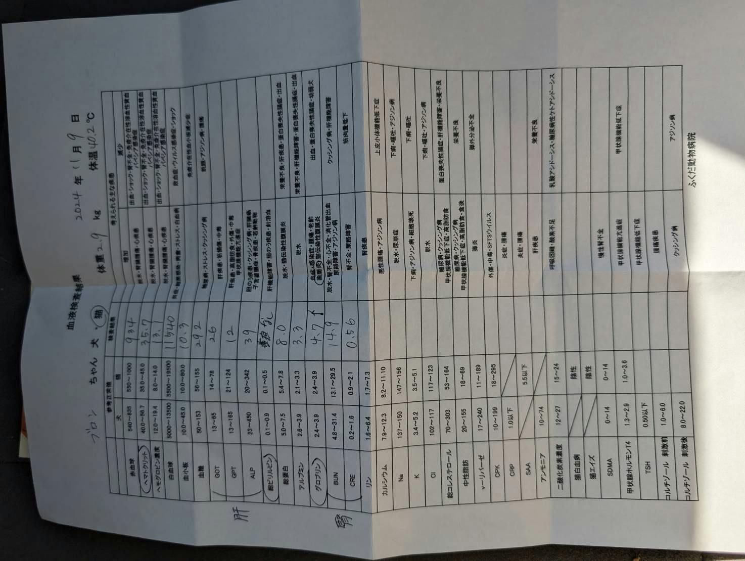 写真のブロンくん 10月1日に保護して去勢手術してシェルターにいます。元気なくグッタリしてるので診察を受けました.熱高いですが腹水なく血液検査も問題ありませんでした。点滴コンベニアで様子をみます。