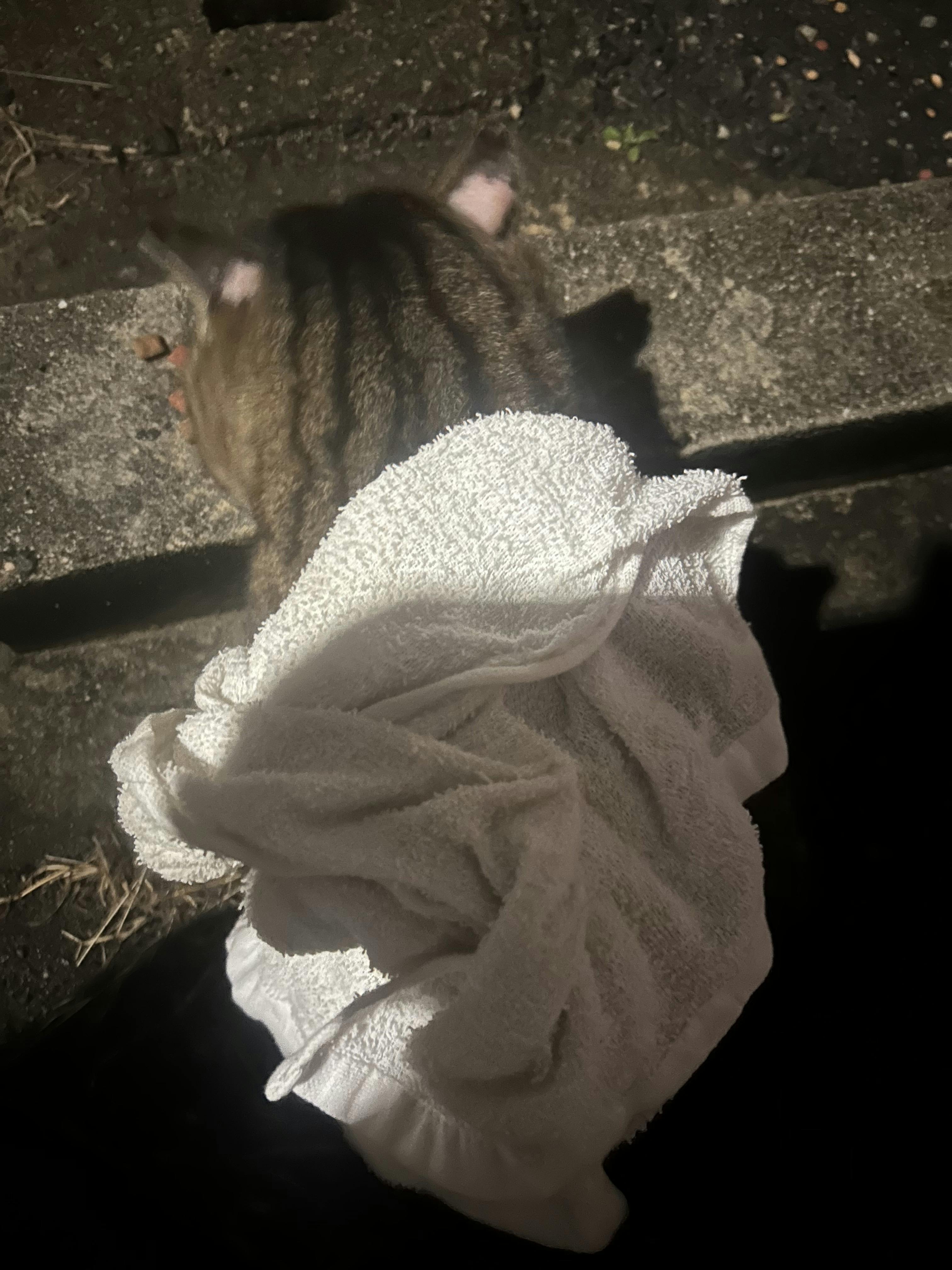 デカ太郎の器を回収に向かいました。溢れてフニャフニャにもなったカリカリを拾ってたら,後方から鳴き声がした。