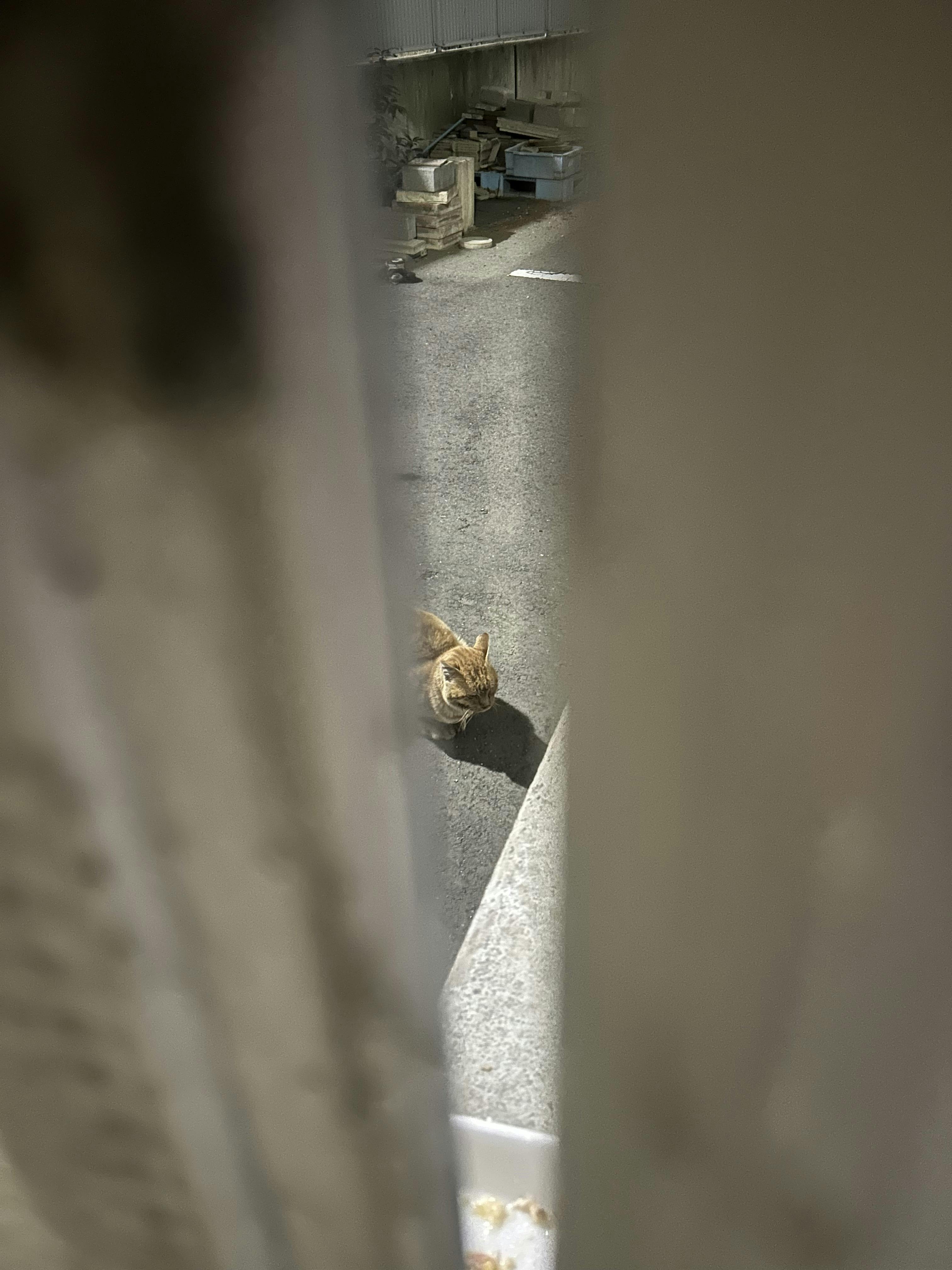 それから資材置き場に入って行った。カツオ節待ちね!一本そのまま咥えて行き,また戻ってきた。もう無くて、、裕美さんから届いたモンプチささみスープ仕立てを隙間から差し出すと食べた!