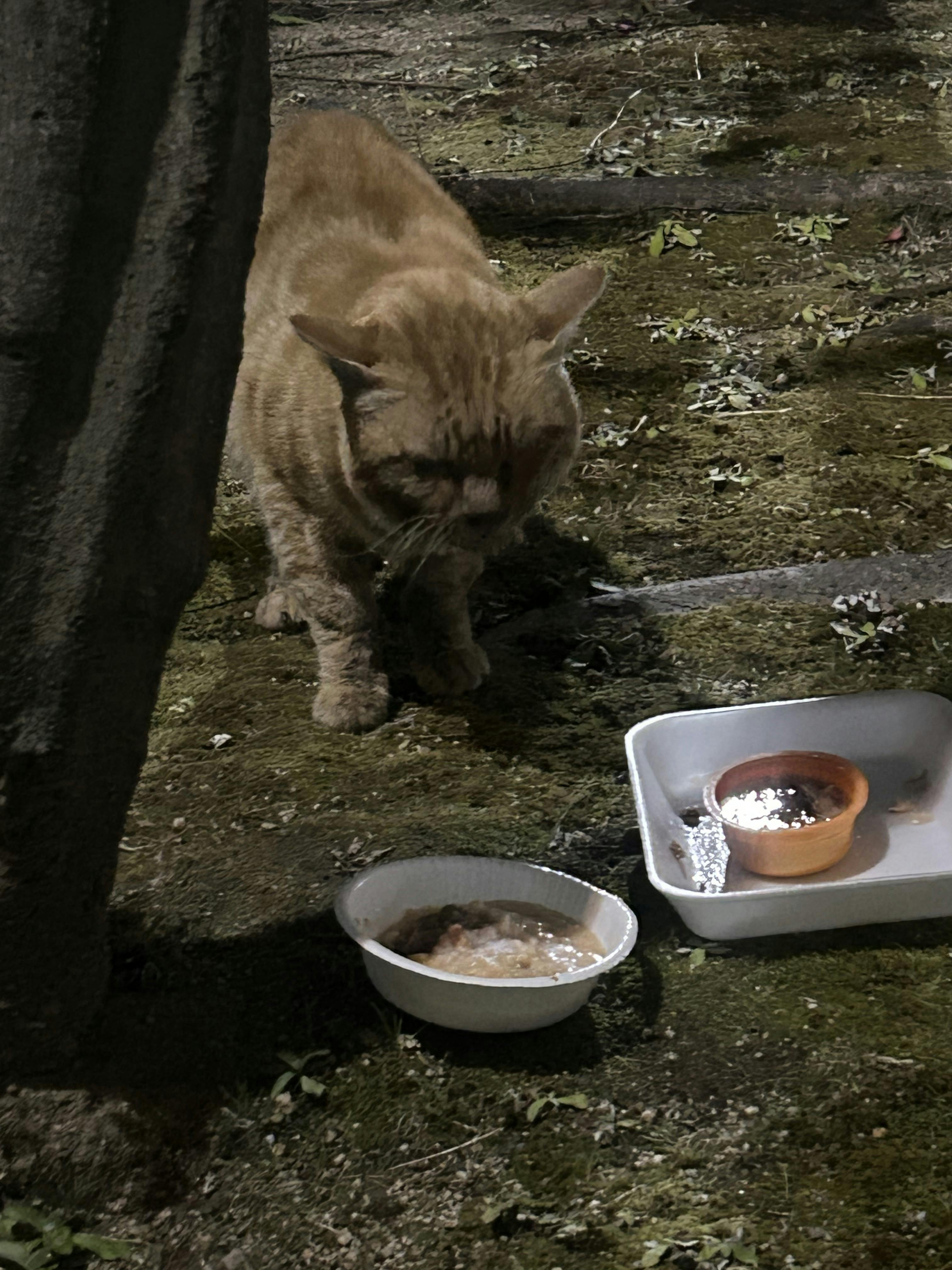 紀伊と遊んで,さぁ次に行こうと思ったら、チャー君がジーとこちらを見てた。気づいてあげれて良かった。激しい威嚇を受けながらフードをそっと差し出す、なかなか口をつけない。