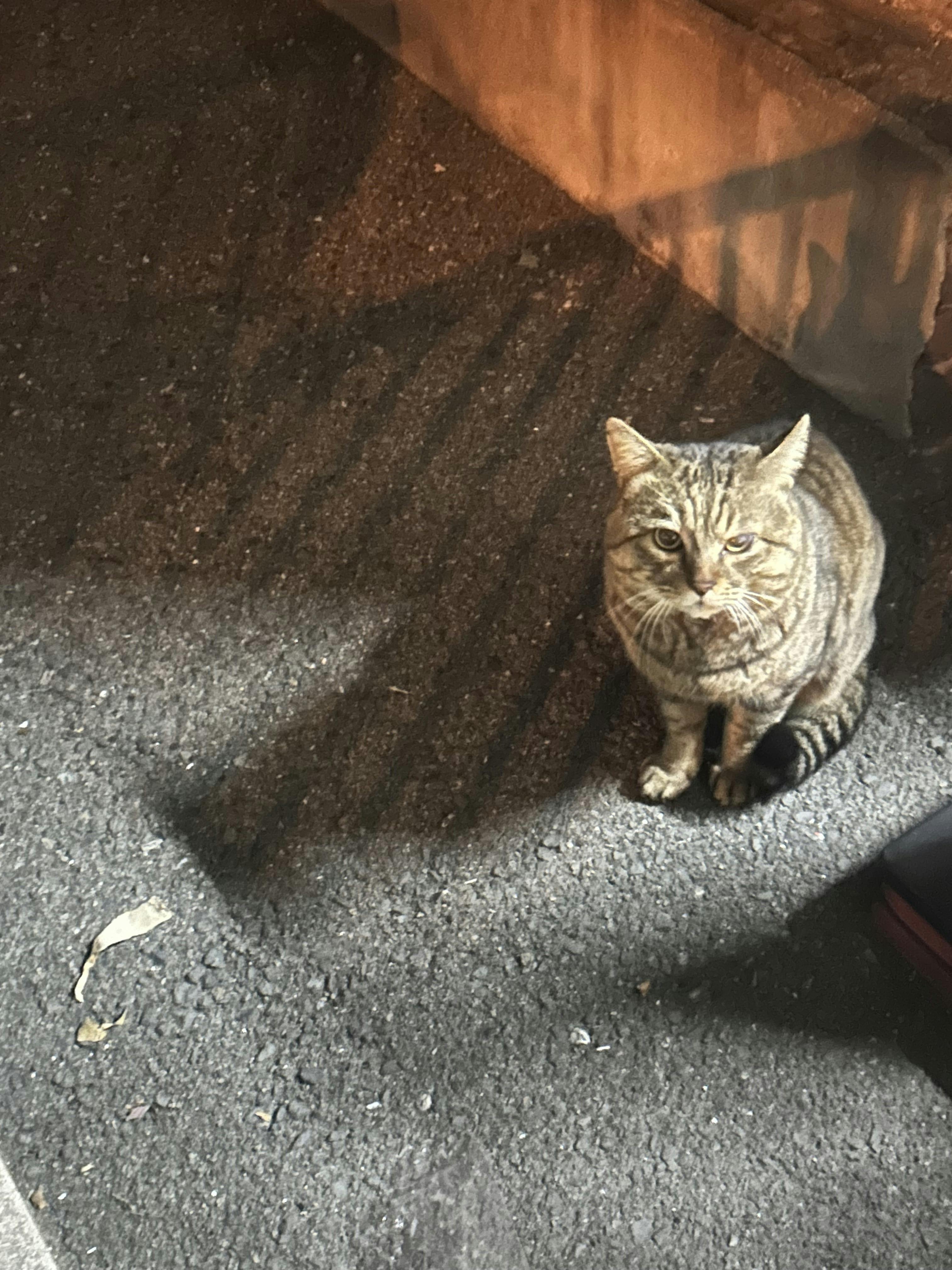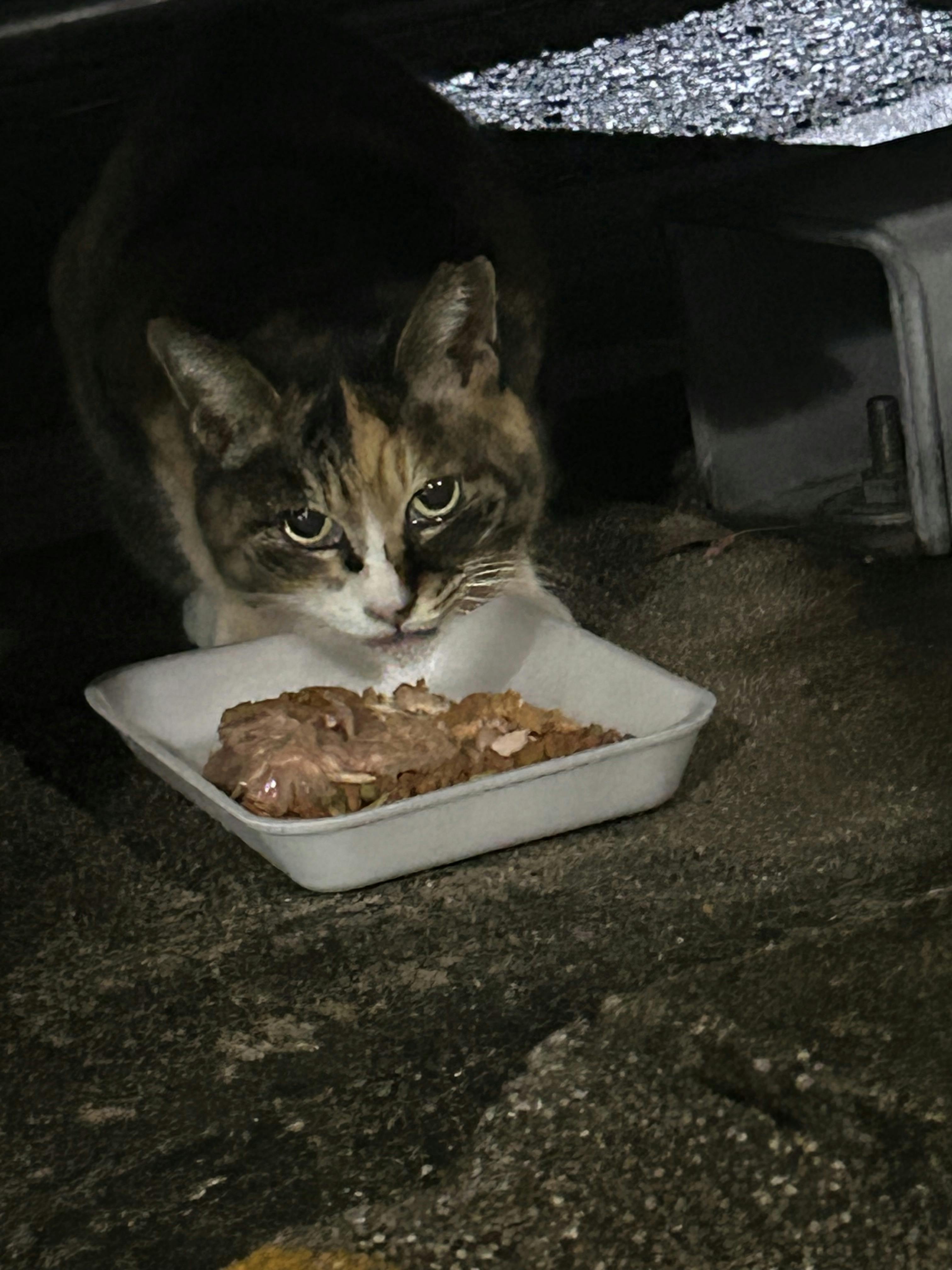 うちの家が見える場所で私が出てくるのを待つミケちゃん。1番最初に食べるからパウチが熱い時もある。Horiはふうふうして冷まします。