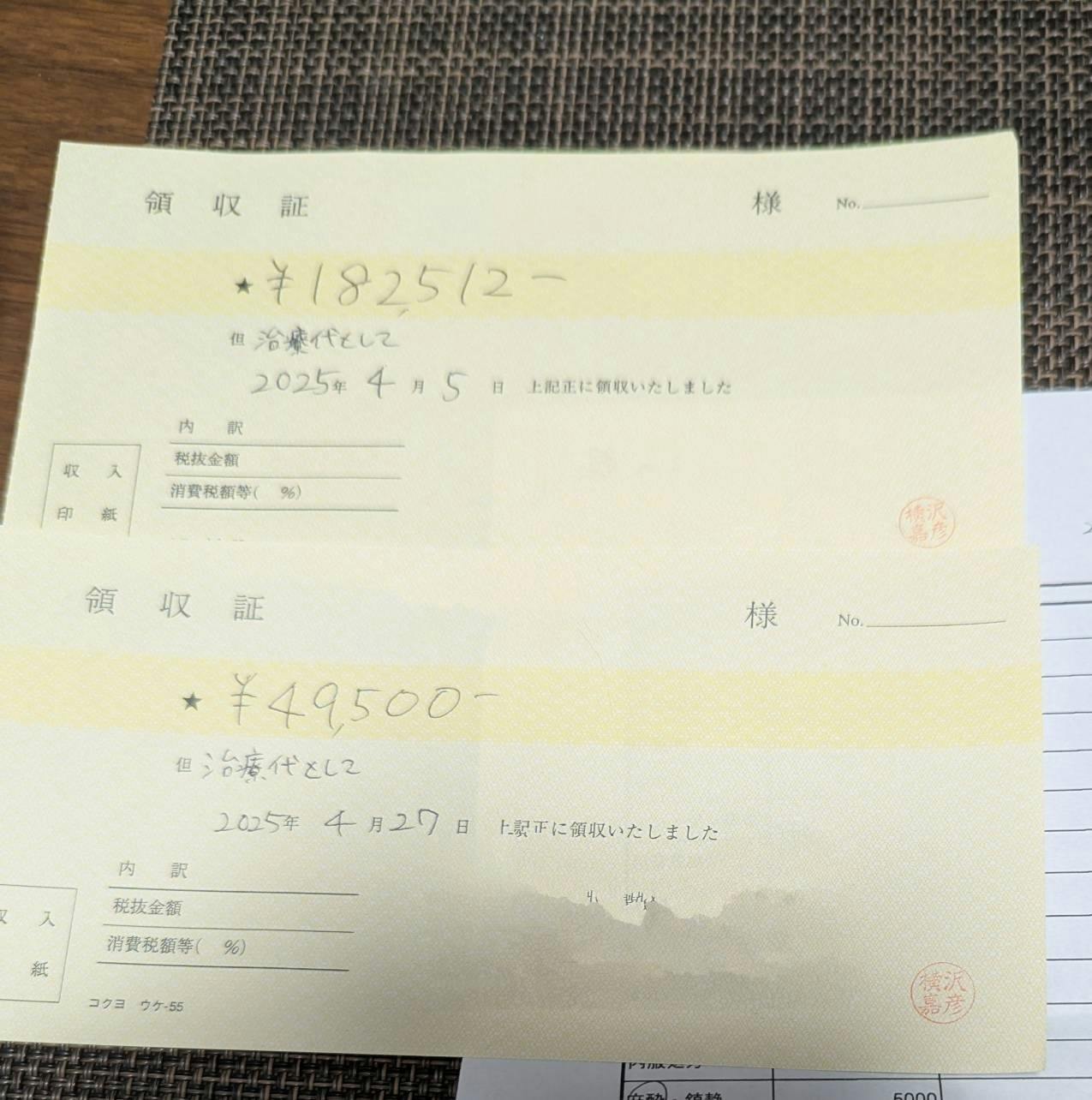治療費と入院費の半分12万を渡しました。