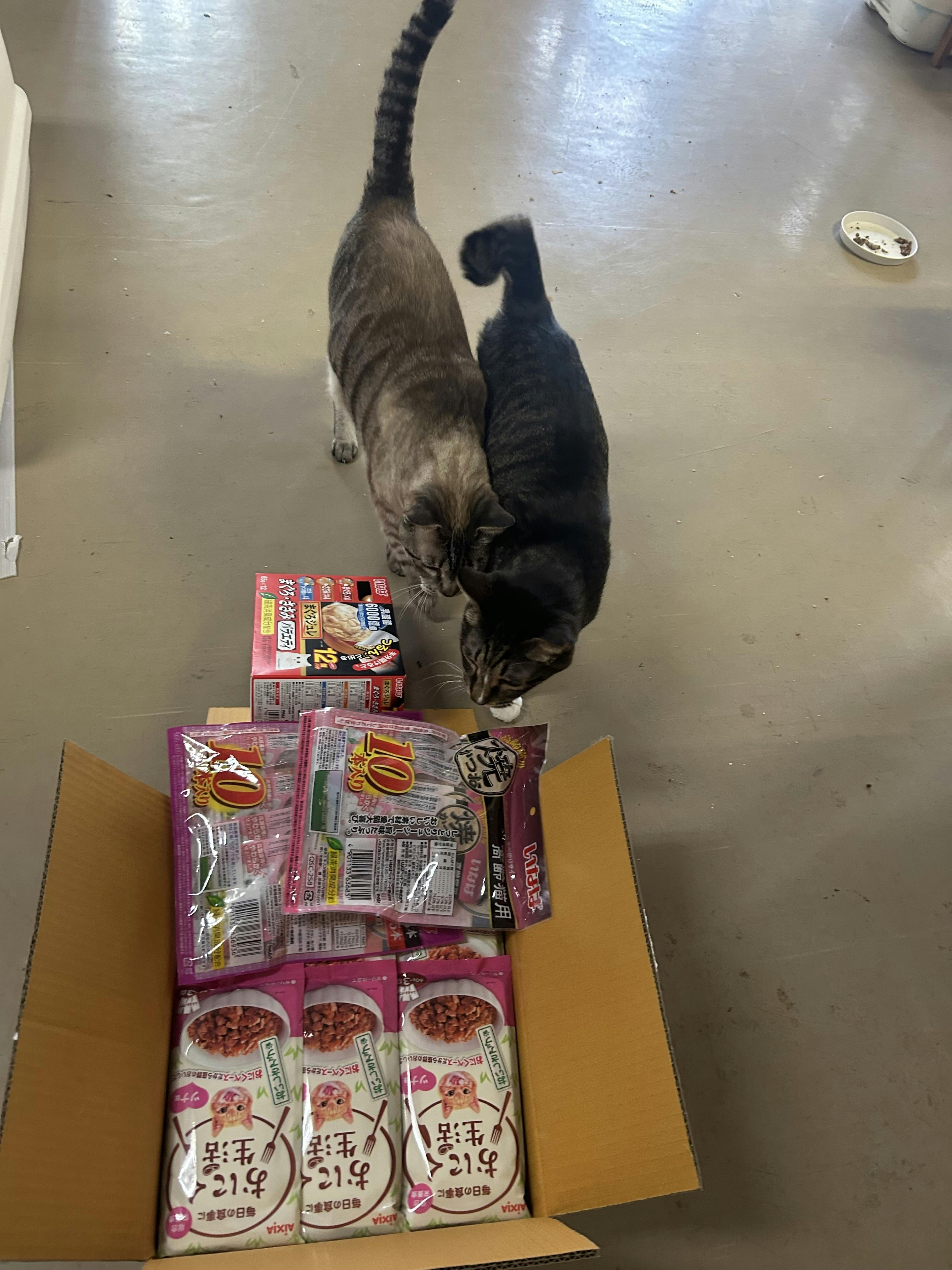 里子さんいつも猫達に優しいお気持ちをありがとうございます。早速、猫缶を分け与える事が出来ましたとても嬉しいです。こちらもすごく助かります。風邪薬を混ぜ、なっちゃんの口にエナジーチュールを入れました。写真撮りたいのですが、私の指はチュールとad缶で、、余裕なく給餌してますゆえ写す事が出来ないのです。贈り主様のお名前がわかりませんありがとうございました。嬉しいです